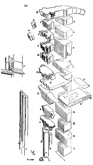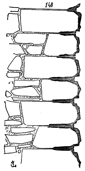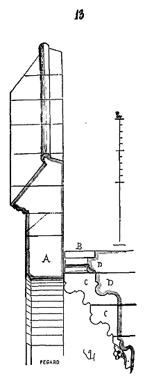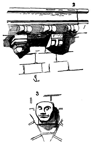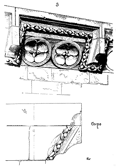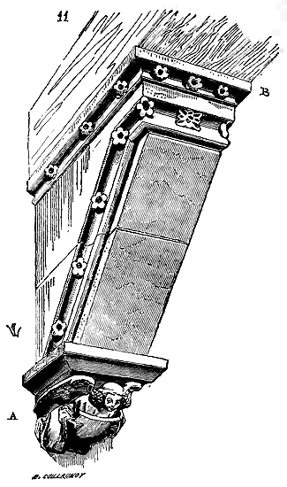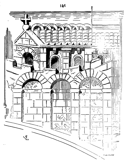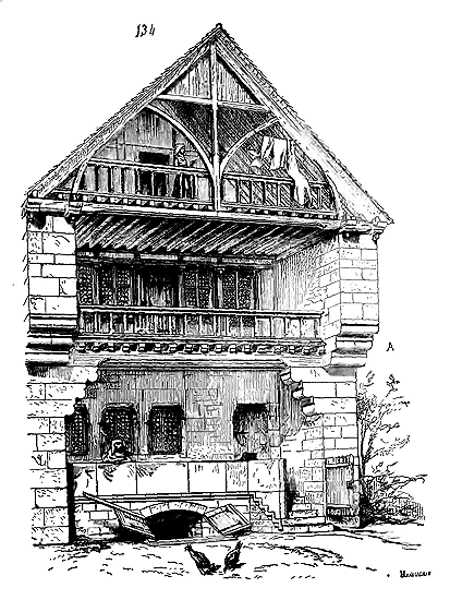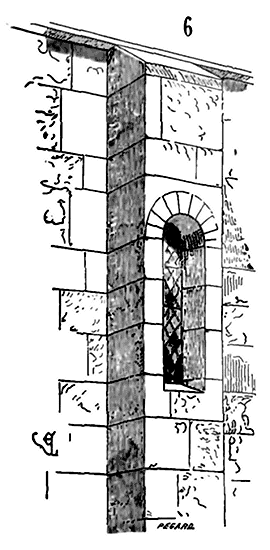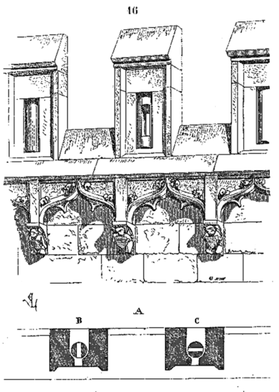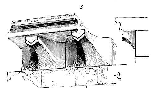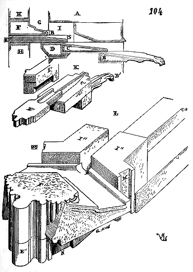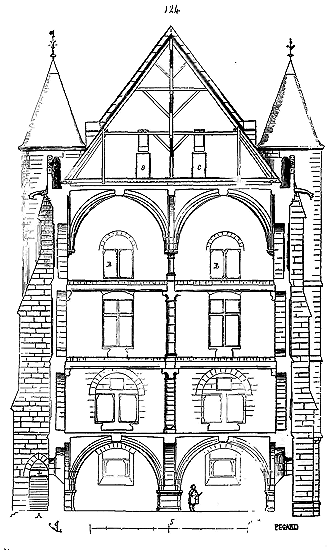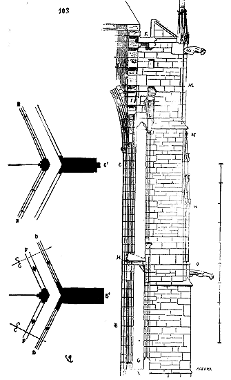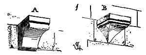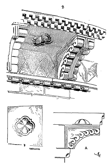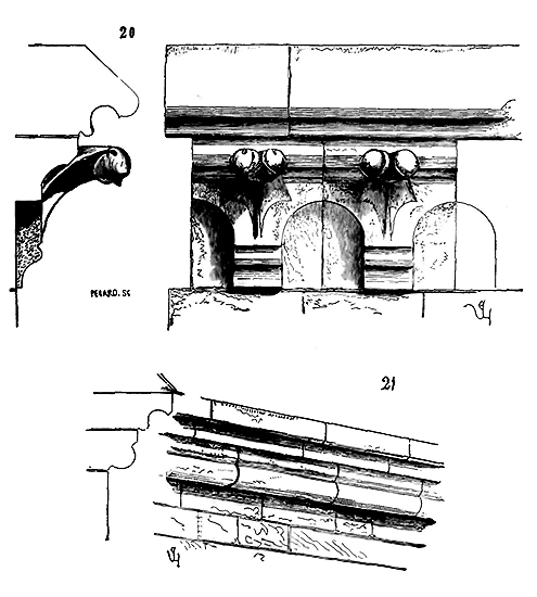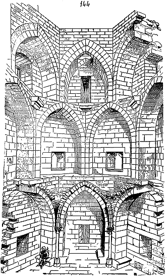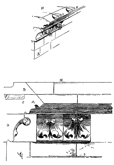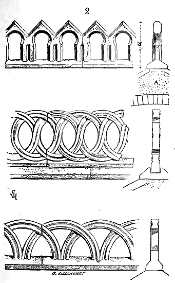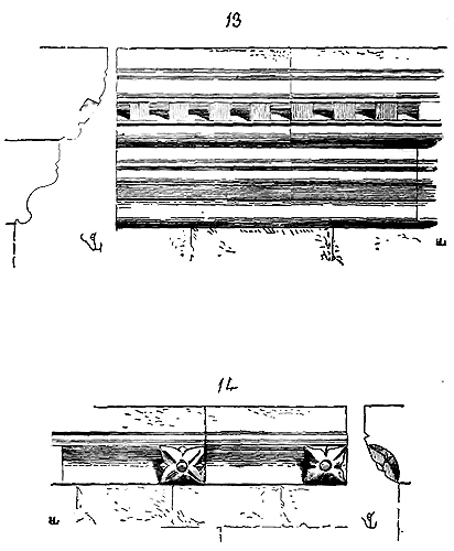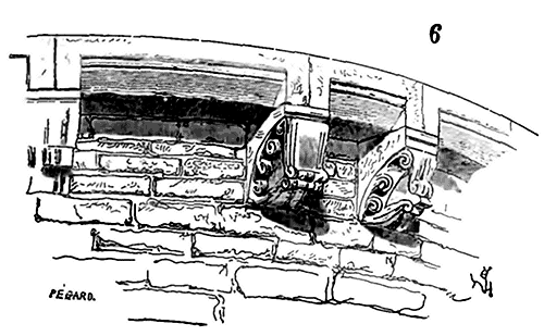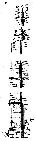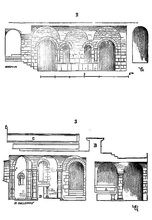 Notre fig. 2 donne une idée de ce genre de construction. Afin de relier les diverses parties des bâtisses, de chaîner les murs dans leur longueur, ils noyèrent dans les massifs, à différentes hauteurs, sous les appuis des fenêtres, au-dessous des corniches, des pièces de bois longitudinales, ainsi que nous l'avons figuré en A (voy. CHAÎNAGE). Dans ces constructions, la pierre est économisée autant que faire se peut; aucun morceau ne présente d'évidements: tous sont posés en besace; ce n'est qu'un revêtement exécuté d'ailleurs avec le plus grand soin; non-seulement les parements sont layés, mais aussi les lits et les joints, et ces pierres sont posées à cru sans mortier, comme l'appareil romain.
