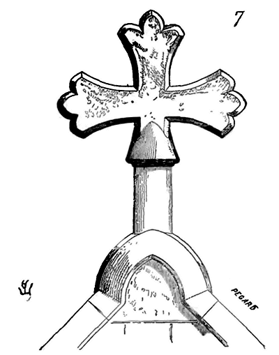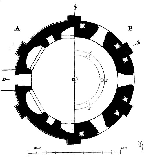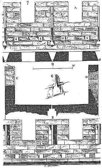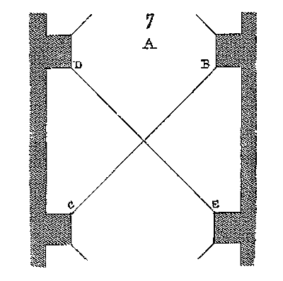 Le résultat de ces tâtonnements fut que les voûtes d'arêtes n'étaient plus des pénétrations de cylindres ou de cônes, mais d'ellipsoïdes. La première difficulté étant franchie, des perfectionnements rapides ne devaient pas tarder à se développer. Mais d'abord, comment, par quels procédés mécaniques ces voûtes étaient-elles construites? La voûte d'arête romaine, construite par travées, n'avait point d'arcs doubleaux: elle portait sur des piles ou des colonnes saillantes, ainsi que le représente la fig. 7, c'est-à-dire (voy. la projection horizontale A d'une de ces voûtes) que les diagonales B C, D E, produites par la pénétration de deux demi-cylindres de diamètres égaux et formant arêtes saillantes, portaient sur angles saillants des piles. Mais les architectes romans ayant d'abord renforcé les grandes voûtes en berceau par des arcs doubleaux, ainsi que fait voir notre fig. 3, et venant à remplacer ces voûtes demi-cylindriques par des voûtes d'arêtes barlongues, conservèrent les arcs doubleaux; ils ne pouvaient faire autrement, puisque les diagonales de ces voûtes étaient des demi-cercles et que leur sommet s'élevait au-dessus du sommet des arcs dont le diamètre était donné par l'écartement des piles.