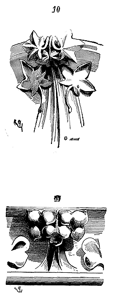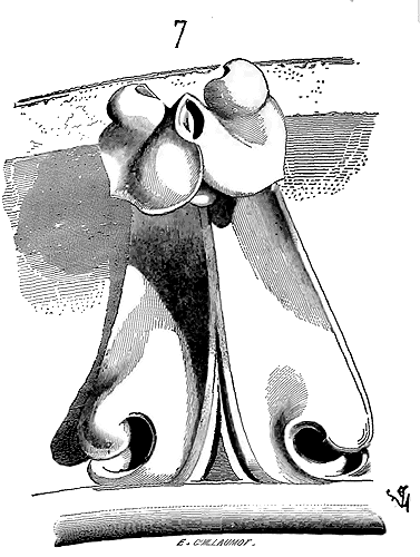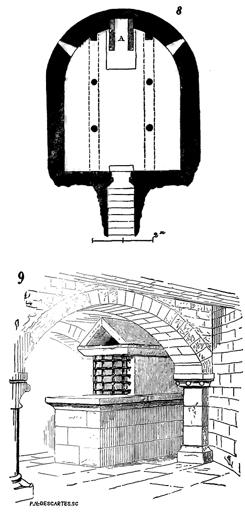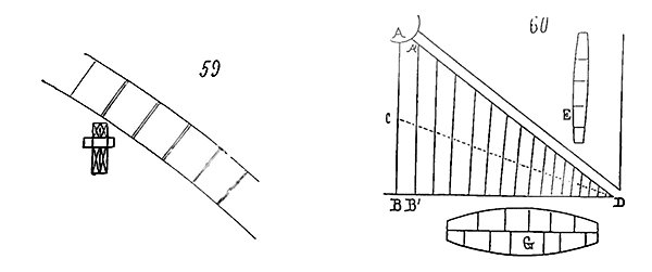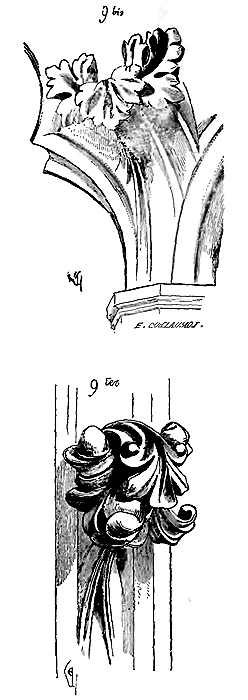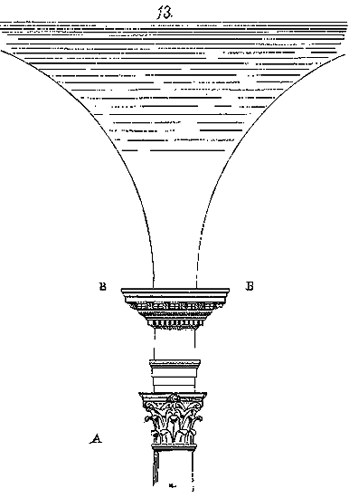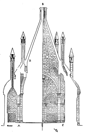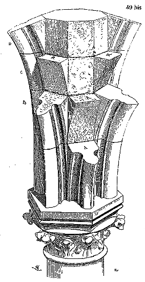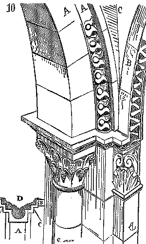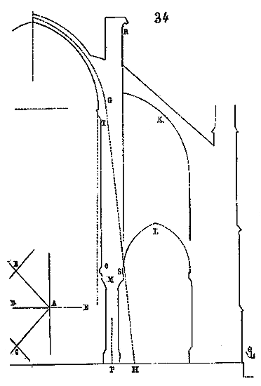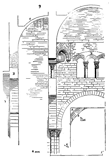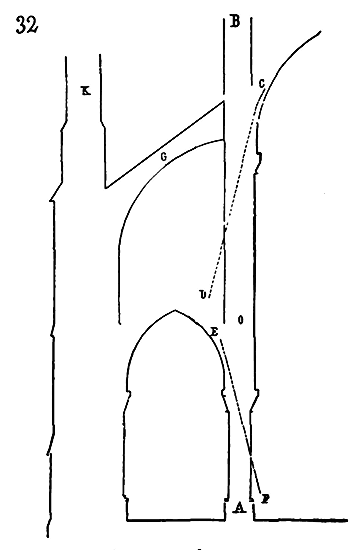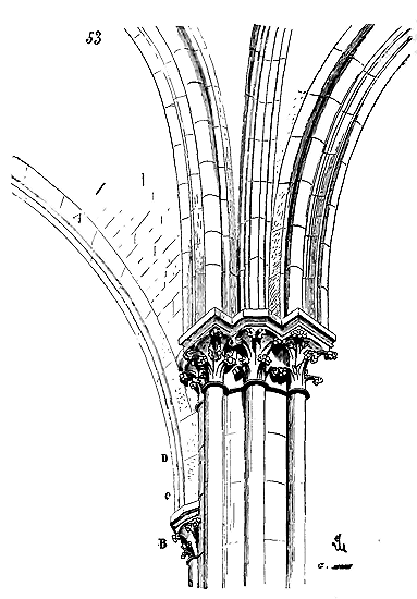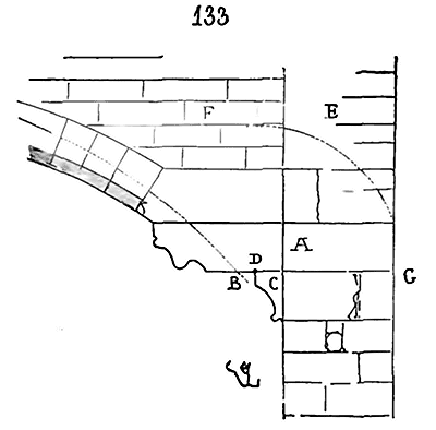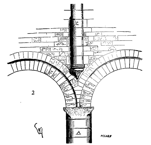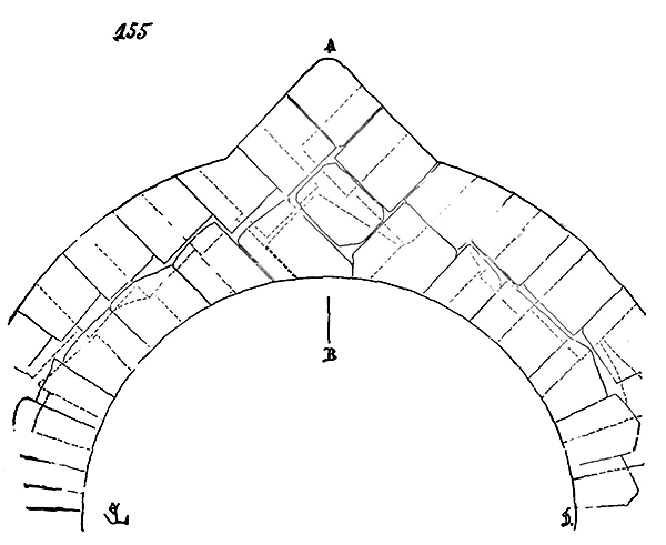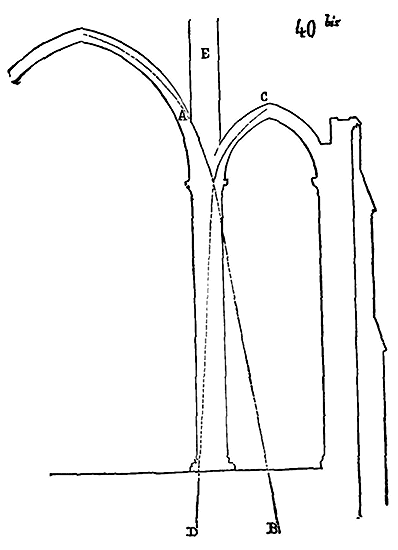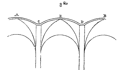 Soit (8 bis) la coupe longitudinale d'une voûte d'arête romane sur plan barlong, la ligne AB est une suite de courbes, ou tout au moins de lignes brisées réunissant les points CD, sommets des arcs transversaux aux points de rencontre E des demi-cercles diagonaux. Il fallait nécessairement conserver sous les points C D des arcs saillants, des arcs doubleaux, qui n'étaient, comme nous l'avons dit plus haut, que des cintres permanents.