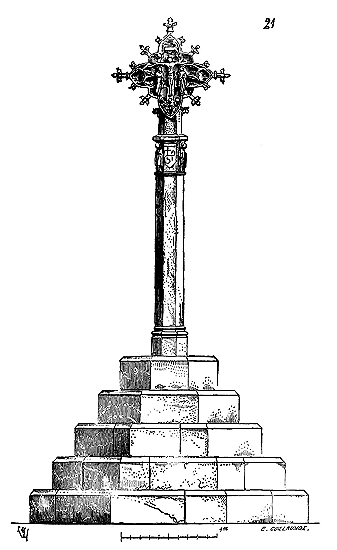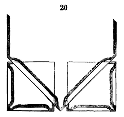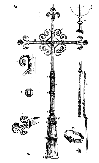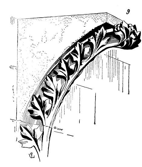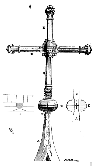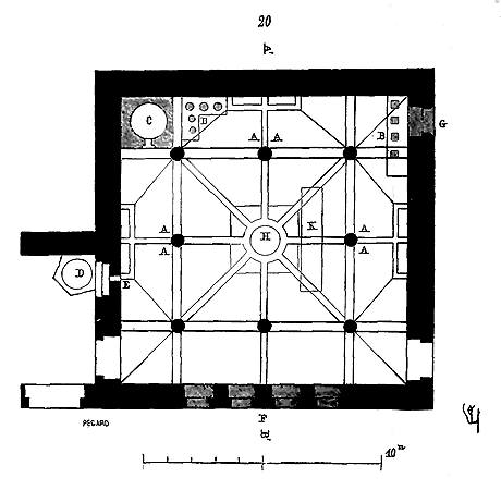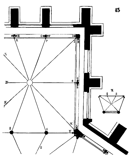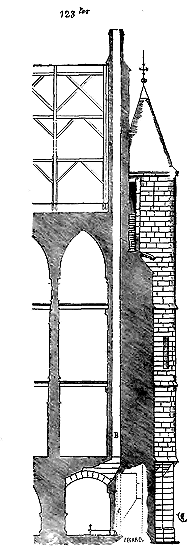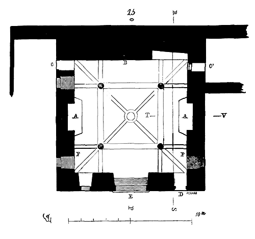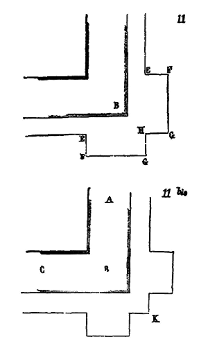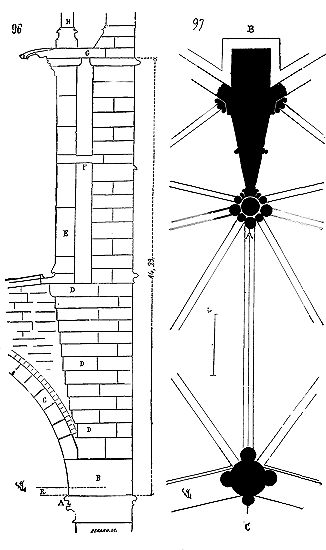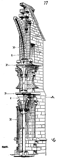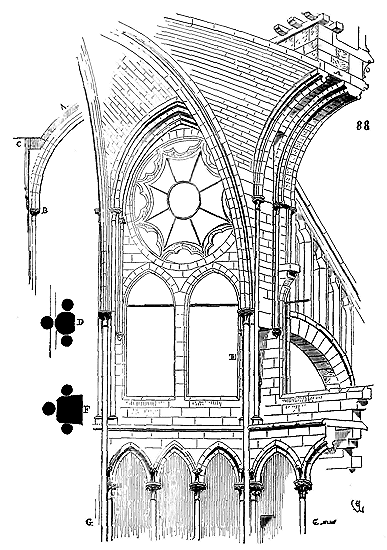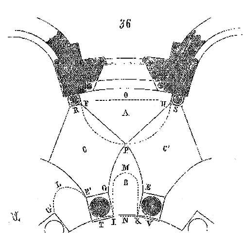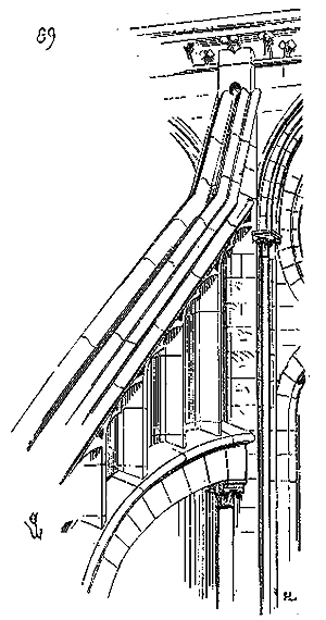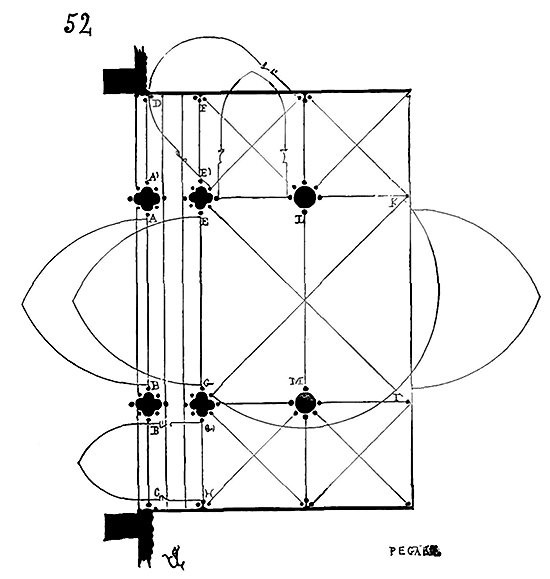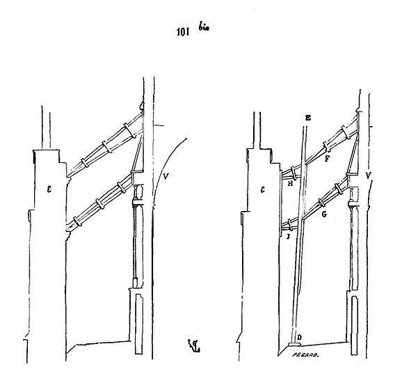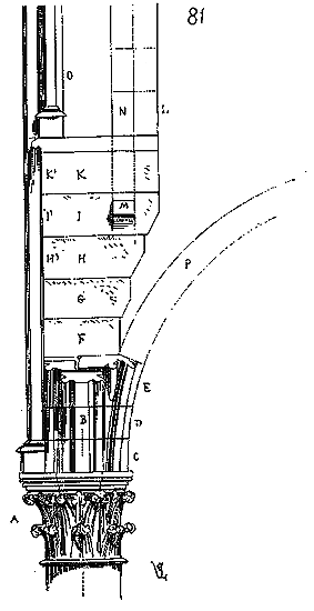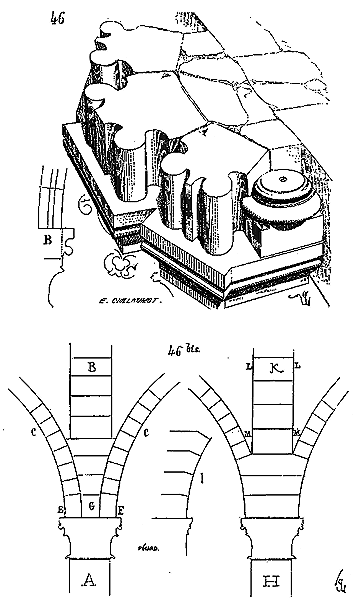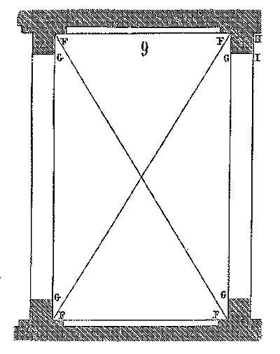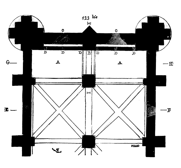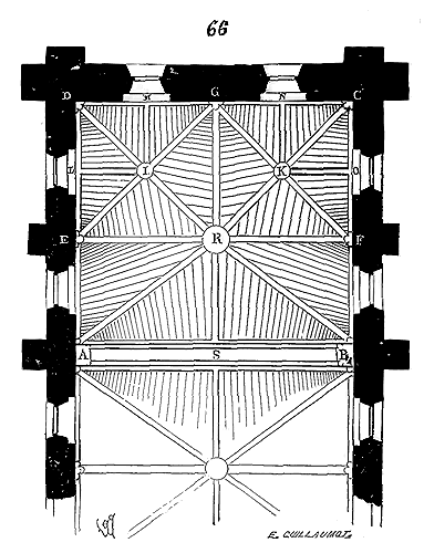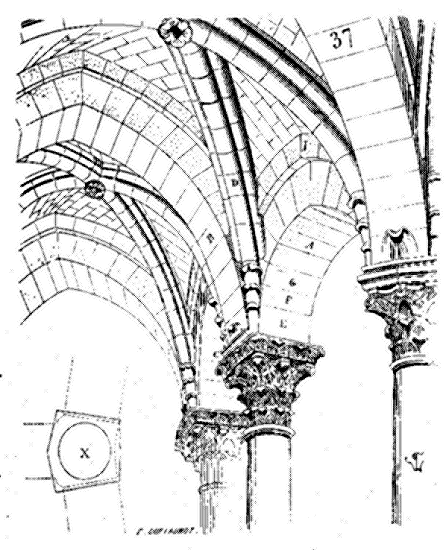Dès lors les arêtes diagonales devaient prendre leur point de départ en retraite de la saillie des piles ou colonnes, celles-ci étant uniquement destinées à porter les arcs doubleaux, c'est-à-dire (9) que les arêtes durent partir des points F au lieu de partir des points G, et que les sommiers des arcs doubleaux se reposèrent sur les assiettes F H G I. Lorsqu'il s'agissait donc de fermer les voûtes, les constructeurs posaient les couchis portant les massifs ou formes en terre sur l'extrados de ces arcs doubleaux et sur les deux cintres diagonaux en charpente.