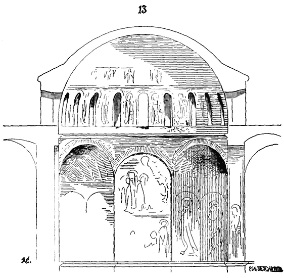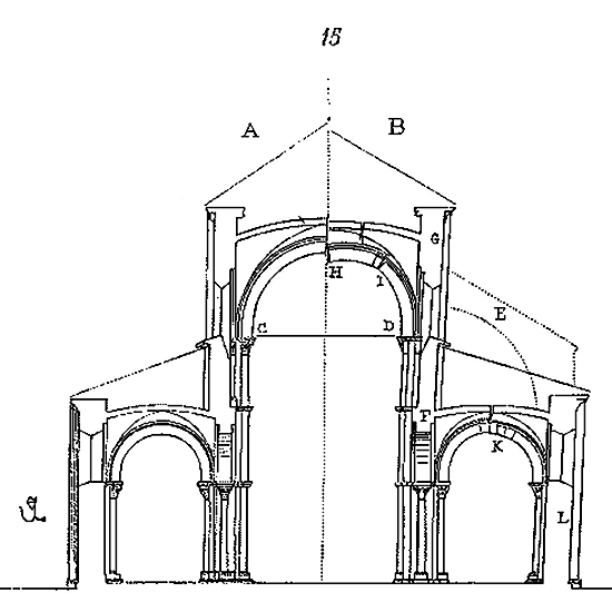 Pendant la durée de l'Empire romain, soit à Rome, soit à Byzance, il est facile de reconnaître que les voûtes avaient été la préoccupation dominante des constructeurs. De la voûte en berceau ils étaient promptement arrivés à la voûte d'arête, et de la coupole portée sur un mur circulaire ou tambour, ils étaient arrivés, dans la construction de l'église de Sainte-Sophie, à la voûte hémisphérique portée sur pendentifs: pas immense, qui établit une ligne de démarcation tranchée entre les constructions romaines de l'antiquité et celles du moyen âge. Ni Rome, ni l'Italie, ni les Gaules ne laissent voir un seul édifice romain dans lequel la voûte hémisphérique soit portée sur pendentifs. L'église de Sainte-Sophie est la première qui nous fournisse un exemple de ce genre de construction, et, comme chacun sait, c'est la plus vaste coupole qui existe. Comment les architectes romains établis à Byzance étaient-ils arrivés à concevoir et exécuter une construction de ce genre? C'est ce que nous ne chercherons pas à démêler. Nous prenons le fait là où, pour la première fois, il se manifeste avec une grandeur et une franchise incontestées. Couvrir une enceinte circulaire par une voûte hémisphérique, c'était une idée fort naturelle et qui fut adoptée dès une haute antiquité; faire pénétrer des cylindres, des voûtes en berceau dans le tambour circulaire, c'était une conséquence immédiate de ce premier pas. Mais élever une coupole hémisphérique sur un plan carré, c'est-à-dire sur quatre piles isolées et posées aux angles d'un carré, ce n'était plus une déduction du premier principe, c'était une innovation, et une innovation des plus hardies.