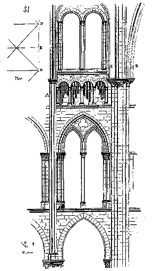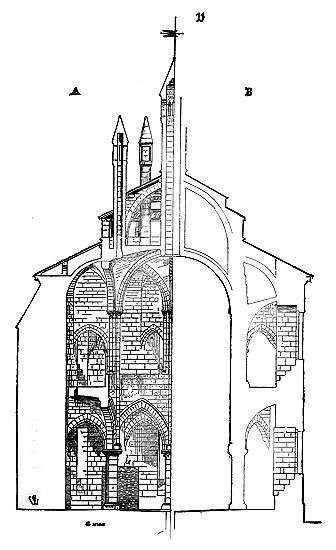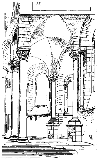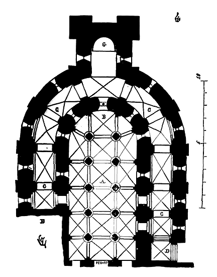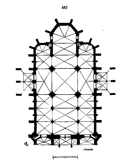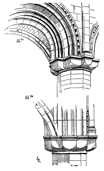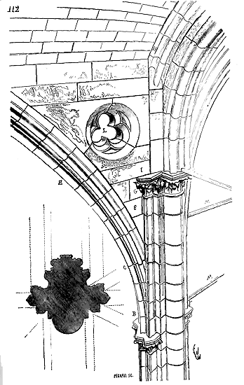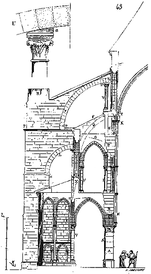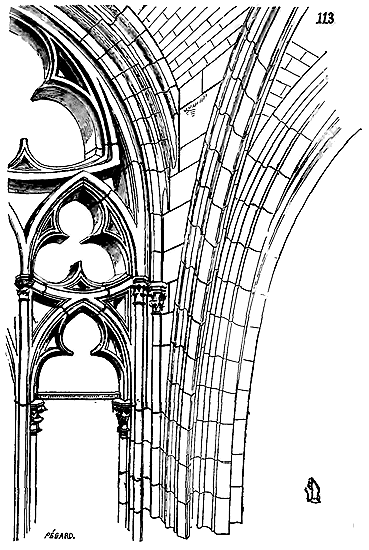 Cependant le moment n'était pas encore venu où les constructeurs allaient résoudre exactement le problème de la stabilité des voûtes posées sur des murs parallèles; ils devaient encore faire des tentatives pour éviter les effets de la poussée sur les murs latéraux. Les constructeurs romans savaient que les voûtes d'arêtes présentaient cet avantage de n'exercer des pressions et des poussées que sur les quatre points d'appui recevant leurs sommiers. Reconnaissant que les berceaux exerçaient une poussée continue sur les têtes des murs, ils cherchèrent à les supprimer et à les remplacer, même dans les nefs composées de travées sur plan barlong, par des voûtes d'arêtes, afin de reporter toute leur charge et leur poussée sur les piles qu'ils espéraient rendre stables. Mais, ainsi que nous l'avons dit plus haut, la voûte d'arête romaine ne peut se bâtir que sur un plan carré: il fallait donc trouver une nouvelle combinaison de voûtes d'arêtes se prêtant aux plans parallélogrammes. Géométriquement, ces voûtes ne pouvaient se tracer, et ce n'était que par des tâtonnements qu'on arrivait à les construire.