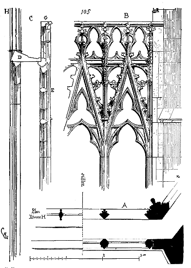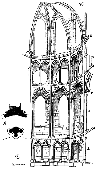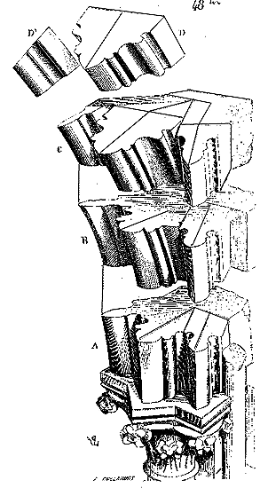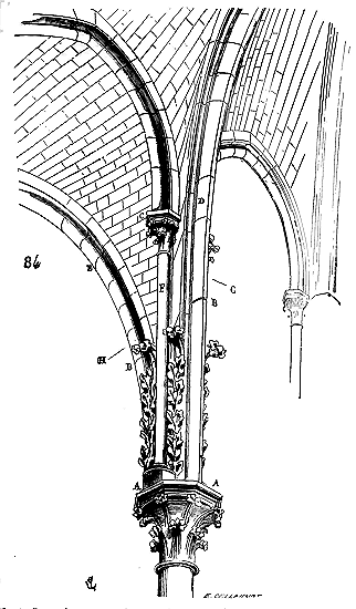 Mais il est nécessaire que nos lecteurs prennent une idée exacte de ce genre de construction. Nous en donnons (3) l'ensemble et les détails. En A sont les piles intérieures portant les arcs doubleaux E, en B les contre-forts destinés à maintenir leur poussée, en C les longrines en bois retenant le berceau D à sa naissance. Afin de reporter la poussée des arcs doubleaux aussi bas que possible, les constructeurs donnaient une forte saillie aux chapiteaux G. Si des voûtes ainsi conçues étaient bandées sur des piles assez solidement construites en matériaux bien liés ou très-lourds, si les murs étaient épais et pleins du bas en haut, si les contre-forts avaient une saillie suffisante; et si les arcs doubleaux et par conséquent les piles n'étaient pas trop espacés, ces berceaux, renforcés de sous-arcs, pouvaient être maintenus. Mais si, comme il arrivait dans les nefs bordées de collatéraux, les murs portaient sur des archivoltes et des piles isolées; si ces piles isolées, que l'on essayait toujours de faire aussi peu épaisses que possible pour ne pas gêner la circulation et la vue, ne présentaient pas une assiette suffisante pour recevoir des contre-forts extérieurs saillants au-dessus des voûtes des bas-côtés; alors le berceau supérieur, malgré ses arcs doubleaux, ou avec ses arcs doubleaux, déversait peu à peu les murs et les piles en dehors, et toute la construction s'écroulait. Vers la fin du XIe siècle déjà, beaucoup d'églises et de salles ainsi voûtées, bâties depuis un demi-siècle, tombaient en ruine, et il fallait les reconstruire. Ces accidents étaient un enseignement pour les constructeurs: ils leur donnaient l'occasion d'observer certains phénomènes de statique dont ils n'avaient pas la moindre idée; ils leur faisaient reconnaître que les longrines de bois noyées dans les maçonneries, dépourvues d'air, étaient promptement pourries, et que le vide qu'elles laissaient ne faisait que hâter la destruction des édifices; que les murs ayant commencé à se déverser, la poussée des voûtes croissait en raison directe de leur écartement; qu'enfin, si les voûtes en berceau étaient posées sur des nefs avec collatéraux, les désordres occasionnés par la poussée des voûtes hautes étaient tels qu'il n'était pas possible de maintenir les piles et les murs dans un plan vertical.