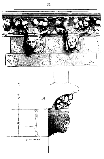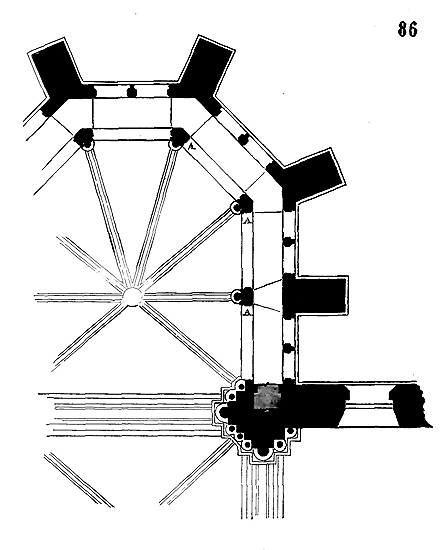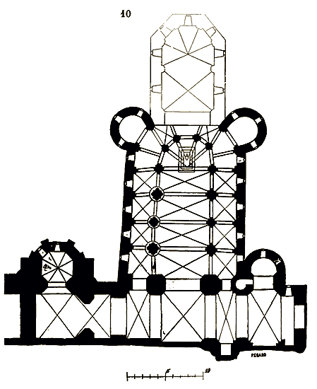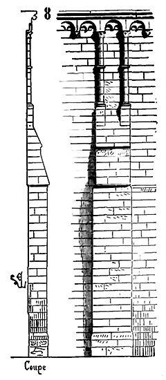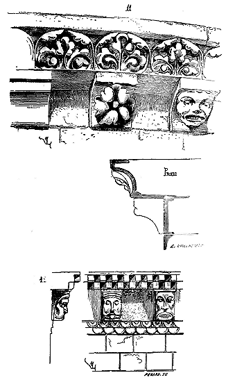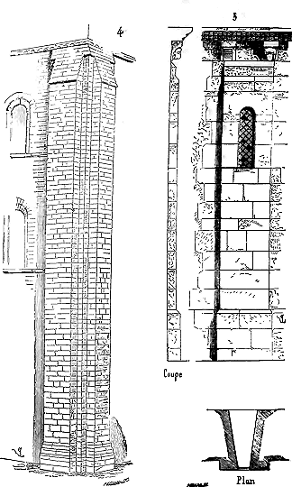 PRINCIPES.--Pour que des principes nouveaux se développent, en toute chose, il faut qu'un état et des besoins nouveaux se manifestent. Quand l'ordre de saint Benoît se réforma, au XIe siècle, les tendances des réformateurs ne visaient à rien moins qu'à changer toute une société qui, à peine née, tombait déjà en décomposition. Ces réformateurs, en gens habiles, commencèrent donc par abandonner les traditions vermoulues de la société antique: ils partirent de rien, ne voulurent plus des habitations à la fois somptueuses et barbares qui jusqu'alors avaient servi de refuge aux moines corrompus des siècles précédents. Ils se bâtirent eux-mêmes des cabanes de bois, vécurent au milieu des champs, prenant la vie comme le pourraient faire des hommes abandonnés à leur seule industrie dans un désert. Ces premiers pas eurent une influence persistante, lorsque même la richesse croissante des monastères, leur importance au milieu de la société les porta bientôt à changer leurs cahutes contre des demeures durables et bâties avec luxe. Satisfaire rigoureusement au besoin est toujours la première loi observée, non-seulement dans l'ensemble des bâtiments, mais dans les détails de la construction; ne jamais sacrifier la solidité à une vaine apparence de richesse est la seconde. Cependant la pierre et le bois sont toujours de la pierre et du bois, et si l'on peut employer ces matières dans une construction en plus ou moins grande quantité, leur fonction est la même chez tous les peuples et dans tous les temps. Quelque riches et puissants que fussent les moines, ils ne pouvaient espérer construire comme l'avaient fait les Romains. Ils s'efforcèrent donc d'élever des constructions solides et durables (car ils comptaient bien bâtir pour l'avenir) avec économie. Employer la méthode romaine la plus ordinaire, c'est-à-dire en composant leurs constructions de massifs de blocages enfermés entre des parements de brique ou de moellon, c'était mettre à l'oeuvre plus de bras qu'ils n'en avaient à leur disposition. Construire au moyen de blocs énormes de pierre de taille, soigneusement taillés et posés, cela exigeait des transports impossibles, faute de routes solides, un nombre considérable d'ouvriers habiles, de bêtes de somme, des engins dispendieux ou d'un établissement difficile. Ils prirent donc un moyen terme. Ils élevèrent les points d'appui principaux en employant pour les parements de la pierre de taille, comme un revêtement, et garnirent les intérieurs de blocages. Pour les murs en remplissage, ils adoptèrent un petit appareil de moellon smillé pour les parements ou de carreaux de pierre, enfermant de même un blocage de cailloux et de mortier.