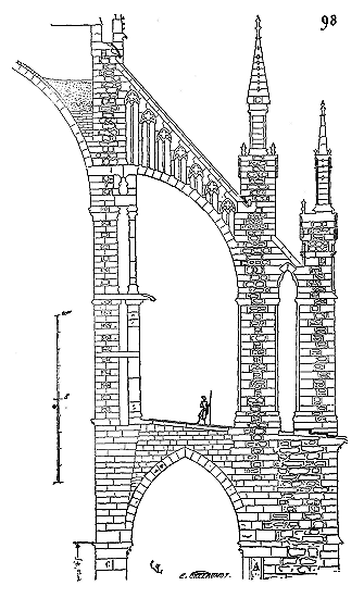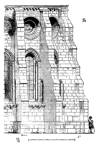 Les constructions romaines, par suite de la stabilité absolue de leurs points d'appui et la concrétion parfaite de toutes les parties supérieures (résultat obtenu, comme nous l'avons déjà dit, au moyen de ressources immenses), présentaient des masses immobiles, passives, comme le pourraient être des monuments taillés dans un seul bloc de tuf. Les constructeurs romans, ne pouvant disposer de moyens aussi puissants, reconnurent bientôt que leurs bâtisses n'offraient pas un ensemble concret, lié, une agglomération parfaitement stable; que les piliers, formés de placages de pierre enfermant un blocage composé souvent de médiocre mortier, que les murs, déliaisonnés dans toute leur hauteur, subissaient des effets, des tassements inégaux qui causaient des déchirures dans les constructions et, par suite, des accidents graves. Il fallut donc chercher les moyens propres à rendre ces effets nuls. Les constructeurs romans, dès le XIe siècle, voulurent, par des motifs développés ailleurs (voy. ARCHITECTURE), voûter la plupart de leurs grands édifices; ils avaient hérité des voûtes romaines, mais ils étaient hors d'état de les maintenir par les moyens puissants que les Romains avaient pu adopter. Il fallut donc encore que leur intelligence suppléât à ce défaut de puissance. La voûte romaine ne se peut maintenir qu'à la condition d'avoir des points d'appui absolument stables, car cette voûte, soit en berceau, soit d'arête, soit en demi-sphère, forme une croûte homogène sans élasticité, qui se brise en morceaux, s'il survient quelques gerçures dans sa concavité. Voulant faire des voûtes à l'instar des Romains, et ne pouvant leur donner des points d'appui absolument stables, il fallait que les constructeurs romans trouvassent une méthode nouvelle pour les maintenir, en rapport avec l'instabilité des points d'appui destinés à les porter et les contre-butter. La tâche n'était pas aisée à remplir: aussi les expériences, les tâtonnements, les essais furent-ils nombreux; mais cependant, dès l'origine de ces essais, on voit naître un système de construction neuf, et ce système est basé sur le principe d'élasticité, remplaçant le principe de stabilité absolue adopté par les Romains. La voûte romaine, sauf de rares exceptions, est faite en blocages; si elle est renforcée par des arcs en brique, ces arcs sont noyés dans l'épaisseur même du blocage et font corps avec lui. Les constructeurs romans, au lieu de maçonner la voûte en blocage, la construisirent en moellons bruts noyés dans le mortier, mais posés comme des claveaux, ou en moellons taillés et formant une maçonnerie de petit appareil; déjà ces voûtes, si un mouvement venait à se déclarer dans les points d'appui, présentaient une certaine élasticité, par suite de la réunion des claveaux, ne se brisaient pas comme une croûte homogène, et suivaient le mouvement des piles. Mais cette première modification ne rassurait pas entièrement les constructeurs romans; ils établirent sous ces voûtes, de distance en distance, au droit des points d'appui les plus résistants, des arcs doubleaux en pierres appareillées, cintrés sous l'extrados des voûtes. Ces arcs doubleaux, sortes de cintres permanents élastiques, comme tout arc composé d'une certaine quantité de claveaux, suivaient les mouvements des piles, se prêtaient à leur tassement, à leur écartement, et maintenaient ainsi, comme l'aurait fait un cintre en bois, les concavités en maçonneries bâties au-dessus d'eux.