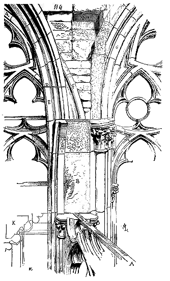 Les constructeurs romans avaient pris aux Romains la voûte d'arête sur plan carré et engendrée par la pénétration de deux demi-cylindres de diamètres égaux. Mais lorsqu'ils voulurent élever des voûtes sur des piles posées aux angles de parallélogrammes, la voûte d'arête romaine ne pouvait être appliquée; ils adoptèrent, dans ce cas, le berceau ou demi-cylindre continu sans pénétration, et, au droit des piles, ils renforcèrent ces berceaux par des arcs doubleaux en pierres appareillées sur lesquels ils comptaient pour éviter les fâcheux effets d'une rupture longitudinale dans ces berceaux, par suite d'un mouvement des piles. Encore une fois, et nous insistons sur ce point, c'était un cintrage permanent. Cependant les obstacles, les difficultés semblaient naître à mesure que les constructeurs avaient cru trouver la solution du problème. Les effets des poussées des voûtes si parfaitement connus des Romains étaient à peu près ignorés des constructeurs romans. Le premier, parmi eux, qui eut l'idée de bander un berceau plein cintre sur deux murs parallèles, crut certainement avoir évité à tout jamais les inconvénients attachés aux charpentes apparentes, et combiné une construction à la fois solide, durable et d'un aspect monumental. Son illusion ne dut pas être de longue durée, car, les cintres et couchis enlevés, les murs se déversèrent en dehors, et la voûte tomba entre eux. Il fallut donc trouver des moyens propres à prévenir de pareils sinistres. On renforça d'abord les murs par des contre-forts extérieurs, par des piles saillantes à l'intérieur; puis, au droit de ces contre-forts et de ces piles, on banda des arcs doubleaux sous les berceaux. Noyant des pièces de bois longitudinales dans l'épaisseur des murs d'une pile à l'autre, à la naissance des berceaux, on crut ainsi arrêter leur poussée entre ces piles. Ce n'était là toutefois qu'un palliatif; si quelques édifices ainsi voûtés résistèrent à la poussée des berceaux, un grand nombre s'écroulèrent quelque temps après leur construction.