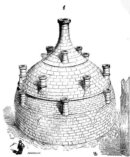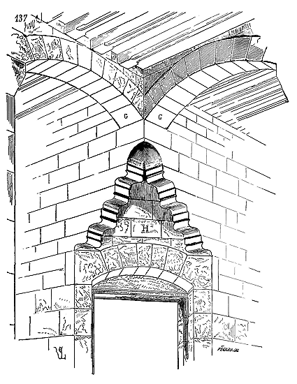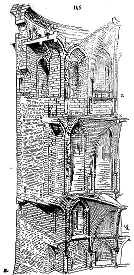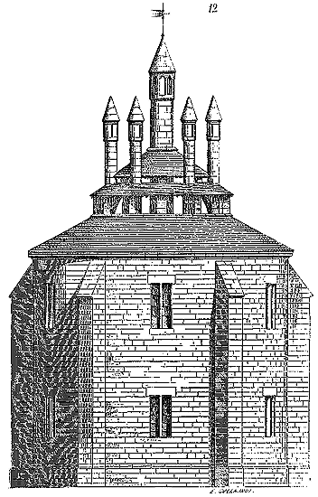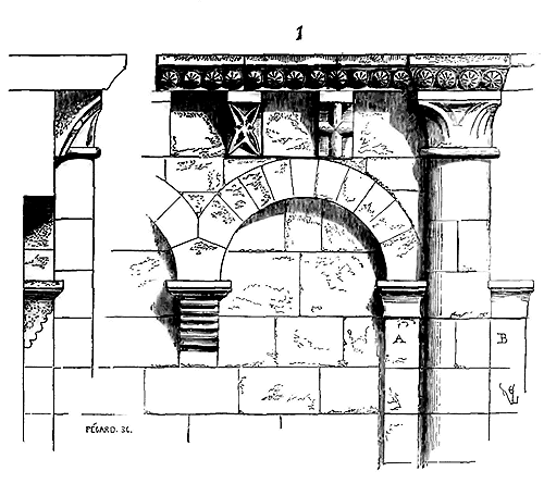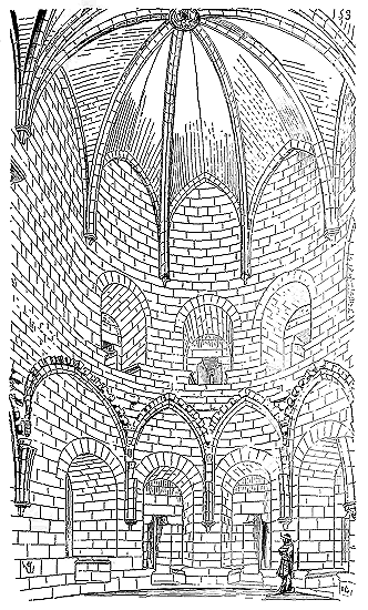 Cependant les constructeurs que Charlemagne fit venir de Lombardie et d'Orient en Occident n'apportèrent pas avec eux ce mode de construction; ils se contentèrent d'élever, comme à Aix-la-Chapelle, des voûtes à base octogonale ou circulaire sur des tambours montant de fond. Ce ne fut que plus tard que les dérivés de la construction byzantine eurent une influence directe en Occident. Quant aux méthodes de bâtir des constructeurs carlovingiens, elles se rapprochaient des méthodes romaines, c'est-à-dire qu'elles consistaient en des massifs de blocages enfermés dans des parements de brique, de moellon ou de pierre, ou encore de moellons alternant avec des assises de brique, le tout maintenu par des joints épais de mortier, ainsi que le fait voir la fig. 1.