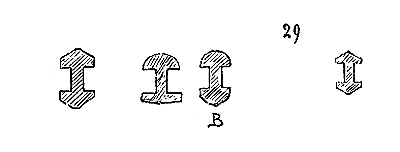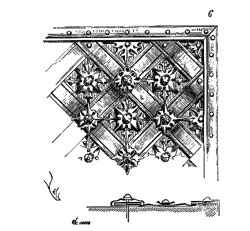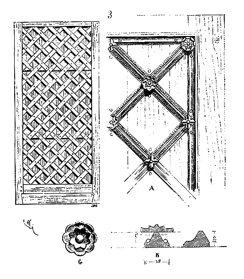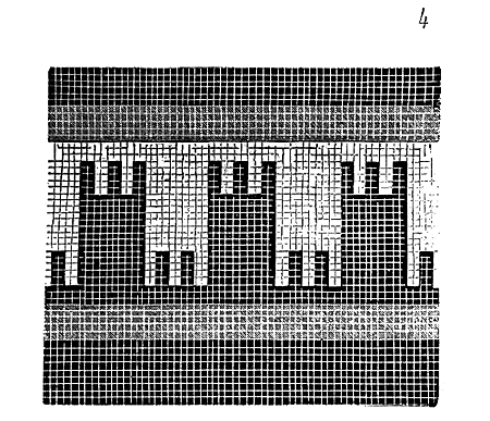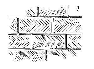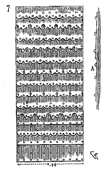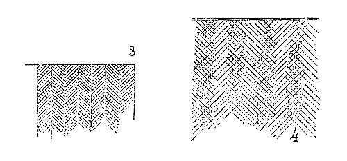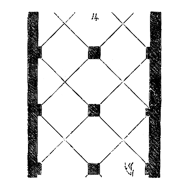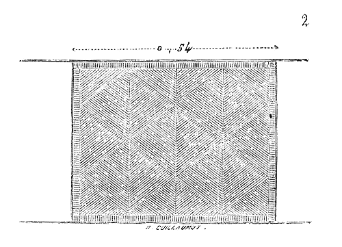 Pendant ce temps, dans les contrées où le grès rouge abonde, dans les Vosges et sur les bords du Rhin, on continue de faire les tailles à l'aide du poinçon, du large ciseau et du marteau de bois. On voit beaucoup de tailles de ce genre à Strasbourg, où l'on se sert encore aujourd'hui du même outillage. Dans la cathédrale de cette ville, on remarque une grande variété de tailles du XIe au XIVe siècle, obtenues avec les mêmes outils. Ainsi, dans la crypte de ce monument, sur le mur nord, on voit des tailles faites au poinçon qui donnent ce dessin (fig. 2).