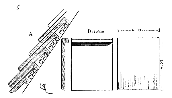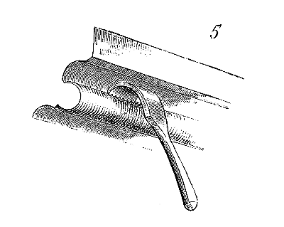 Il faut dire que le grès rouge des Vosges ne peut guère être parementé autrement qu'à l'aide de ce large ciseau, et les tailleurs de pierre de cette contrée mettaient une certaine coquetterie à obtenir des tailles d'une régularité et d'une finesse que permettait la nature des matériaux. Dans l'Île-de-France, nos tailleurs de pierre, au XIIIe siècle, taillent non-seulement les parements, mais aussi les moulures les plus délicates, à la bretture, ce qui exige une grande adresse de main. Cet outil (la bretture) est dentelé avec d'autant plus de finesse, que les profils deviennent plus délicats. Au XIVe siècle, ces profils acquièrent souvent une telle ténuité, que la bretture ne saurait les dégager; alors on emploie la ripe, sorte de ciseau recourbé et dentelé très-fin, et c'est perpendiculairement à la moulure que cet outil est employé (fig. 5).
