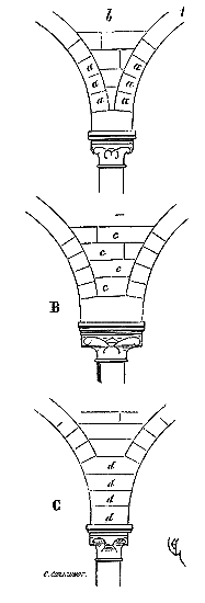 Celle-ci tend à faire glisser ces claveaux ou à les écraser, parce qu'ils présentent leur angle d'extrados sous son action verticale. Alors (voyez en B), dans les constructions bien entendues, ou on laisse entre l'extrados de ces claveaux des assises horizontales c épousant la courbure de l'arc, ou, si la place ne le permet pas, on pose une série de sommiers d (voy. en C) avec lits horizontaux (voyez CONSTRUCTION, fig. 46, 46 bis, 48 ter, 49 bis, 81, 96 et 127). Quelquefois les constructeurs du moyen âge ont formé des arcs presque entièrement composés d'assises en tas de charge, pour éviter les poussées sous une pression considérable. Telles sont appareillées les archivoltes des grandes baies des deux tours occidentales de la cathédrale de Reims, afin de supporter les flèches de pierre projetées sur ces tours.
