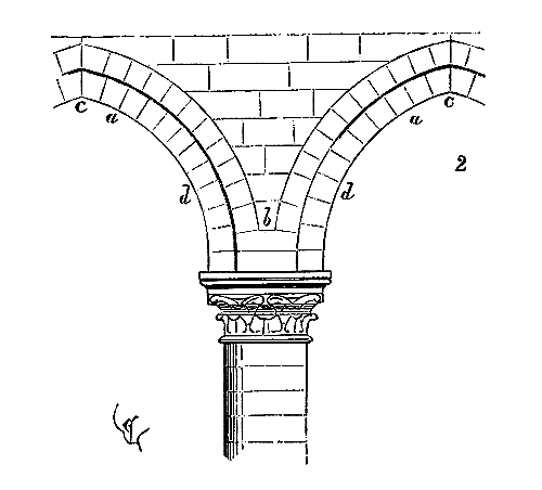 On conçoit aisément que lorsque plusieurs arcs viennent reposer sur la tête d'une pile dont la section n'est pas considérable, les lits inclinés des claveaux a (fig. 1) ne présentent pas une assiette propre à recevoir une charge supérieure b.