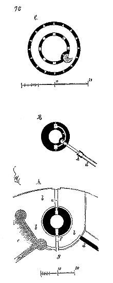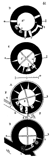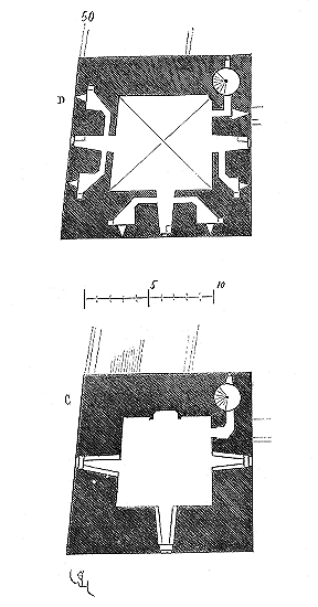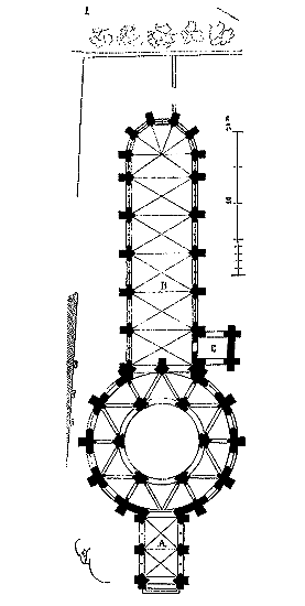 Réunissant les renseignements que nous avons pu nous procurer sur le Temple de Paris 9, nous donnons le plan de l'église (fig. 1). La rotonde datait de la première moitié du XIIe siècle. Après la sortie des templiers de la Palestine, cette rotonde fut augmentée au porche A, dont parle Sauval, et un peu plus tard de la grande nef B. Le bas du clocher C datait également du XIIe siècle, et l'étage du beffroi du commencement du XIIIe siècle.