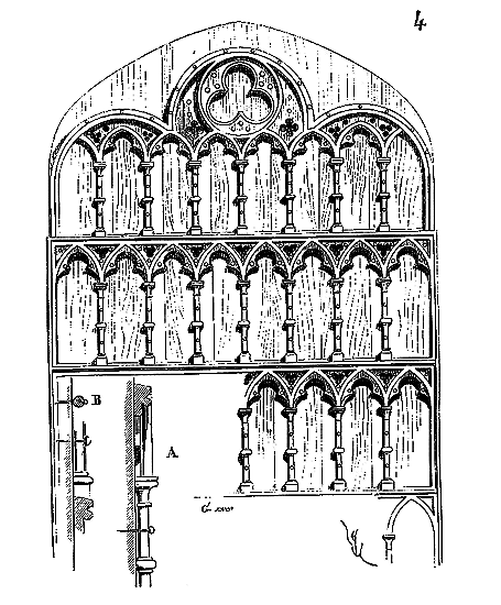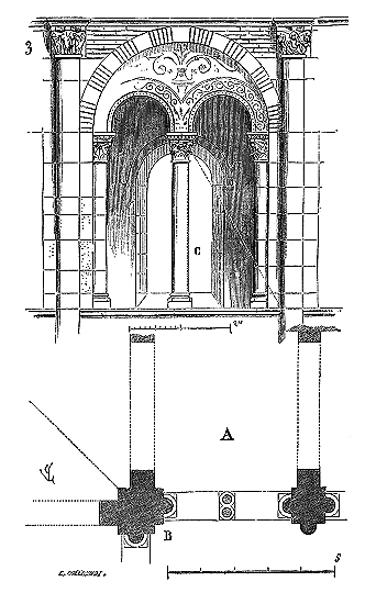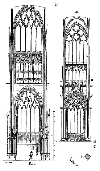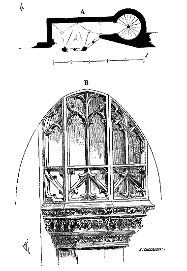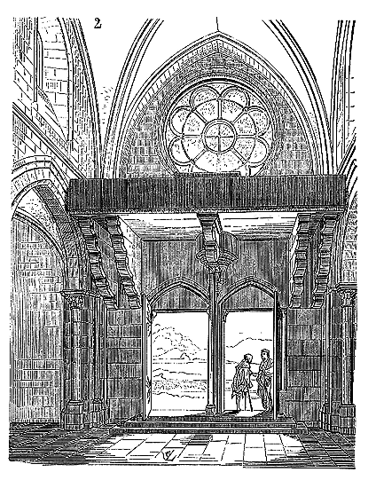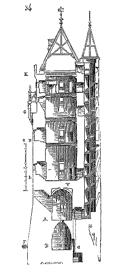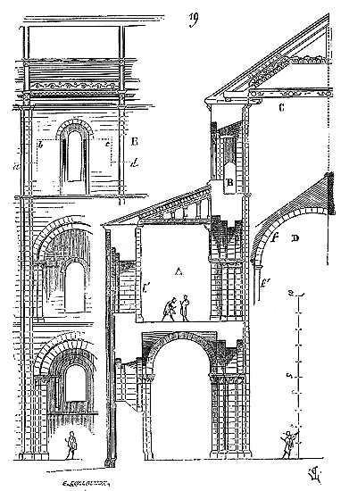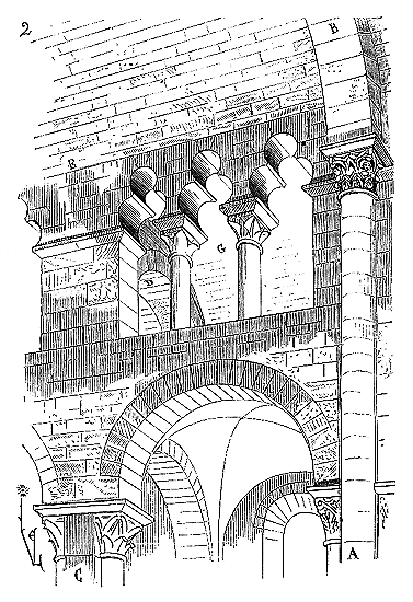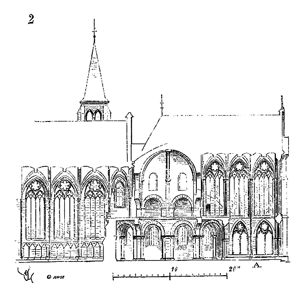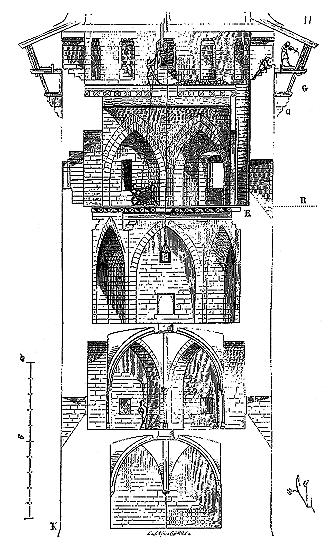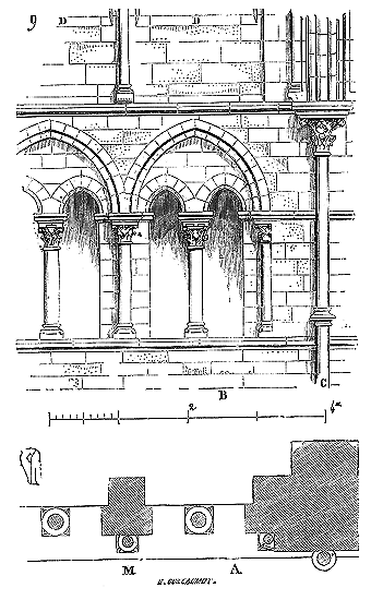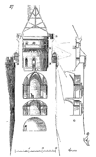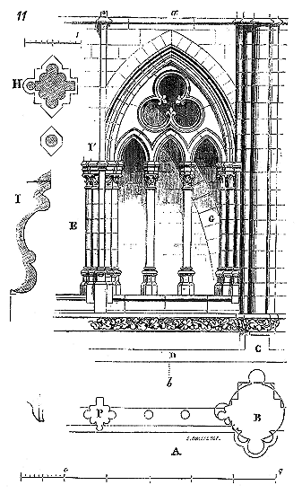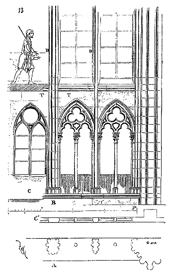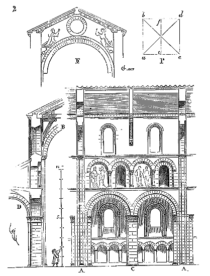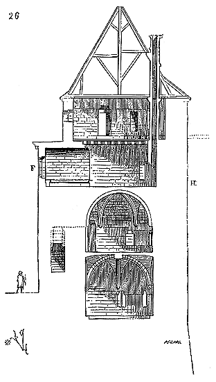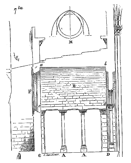 Le porche A était à claire-voie dans la partie inférieure, et vitré dans la partie supérieure. Cette disposition, adoptée fréquemment pour les cloîtres, produisait ici un effet très-pittoresque, ainsi que le remarque Sauval. Une coupe longitudinale (fig. 2) fera saisir la disposition originale de ces constructions ajoutées à la rotonde primitive.