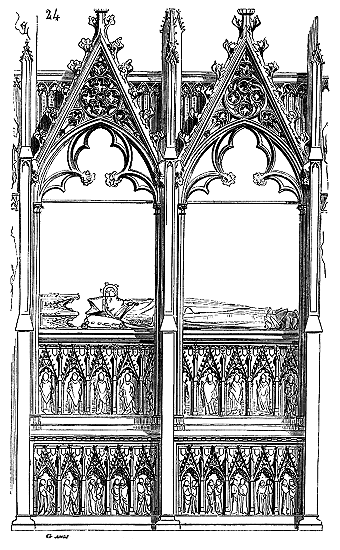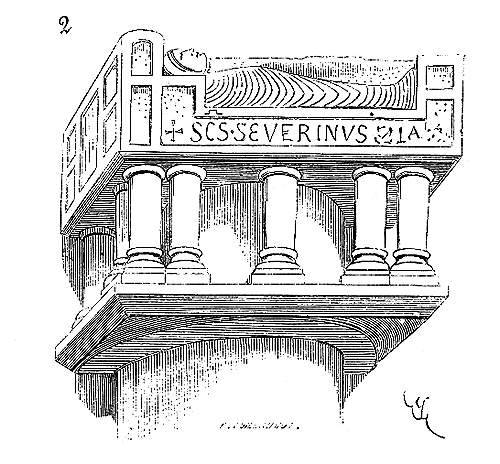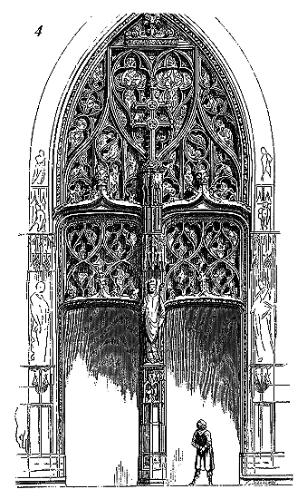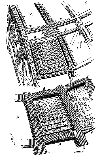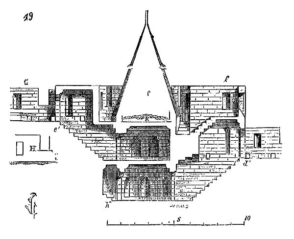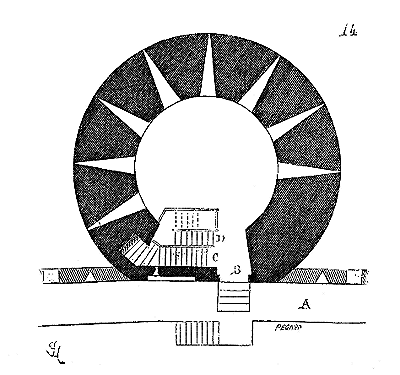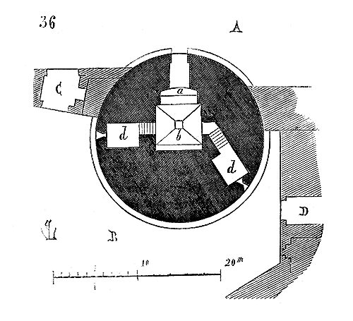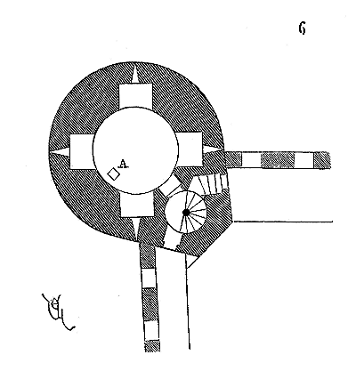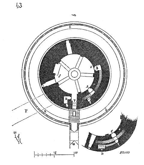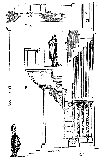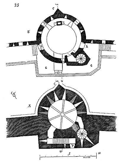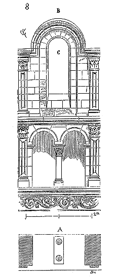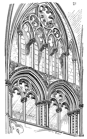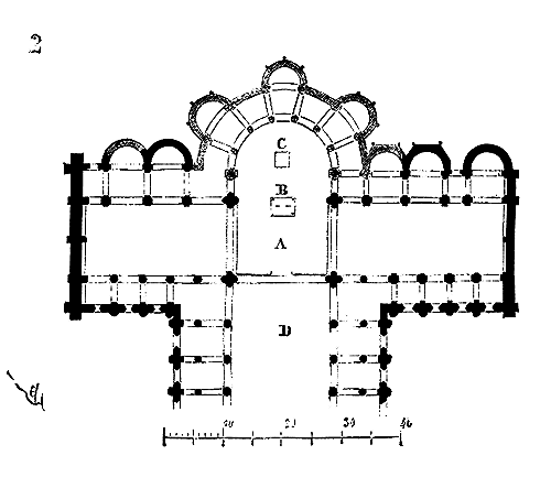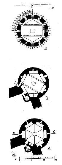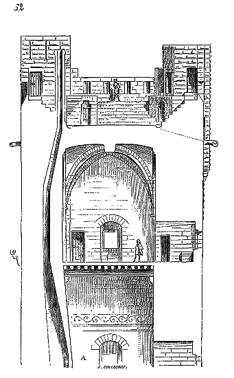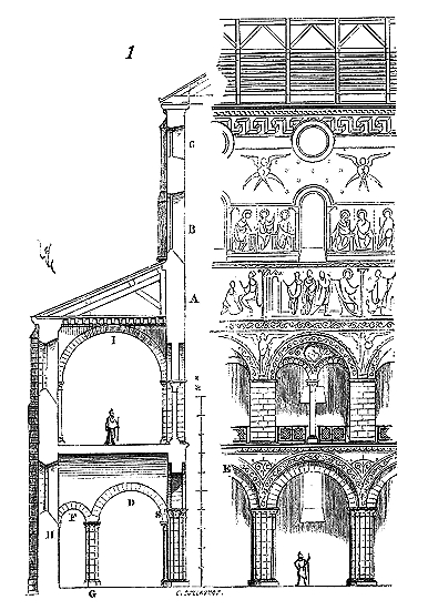 Le porche A était à claire-voie dans la partie inférieure, et vitré dans la partie supérieure. Cette disposition, adoptée fréquemment pour les cloîtres, produisait ici un effet très-pittoresque, ainsi que le remarque Sauval. Une coupe longitudinale (fig. 2) fera saisir la disposition originale de ces constructions ajoutées à la rotonde primitive.
