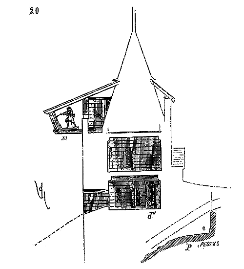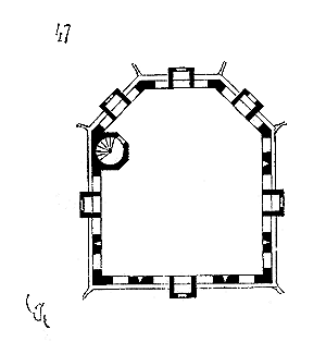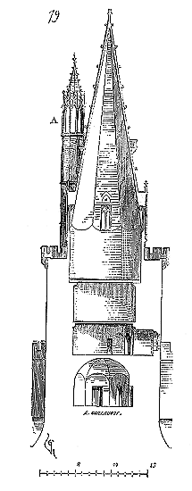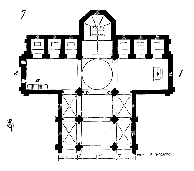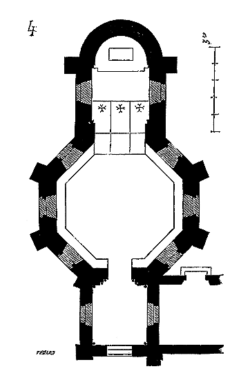 Cette chapelle (fig. 4) parait avoir été bâtie d'un seul jet, sauf l'abside, qui peut être quelque peu postérieure. Elle possède un porche ou narthex, avec tribune au-dessus, bâtie après coup, et qui était mise en communication avec les logis de la commanderie. Les murs de l'octogone ont trois pieds d'épaisseur, les contre-forts trois pieds de largeur. Une assise de bancs de pierre est disposée à la base des parois intérieures. Voici (fig. 5) la coupe longitudinale de cette chapelle. La voûte est construite à pans, avec nervures saillantes sous les arêtes rentrantes.