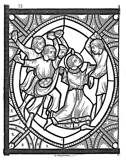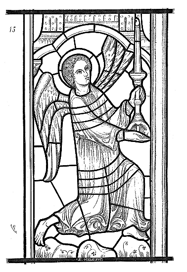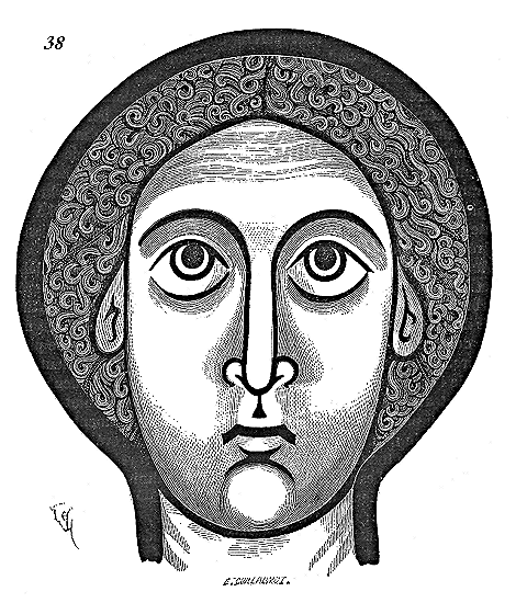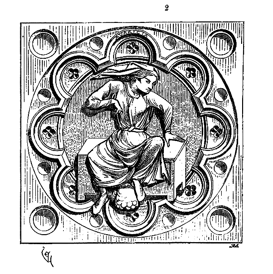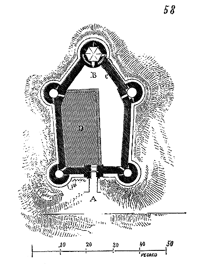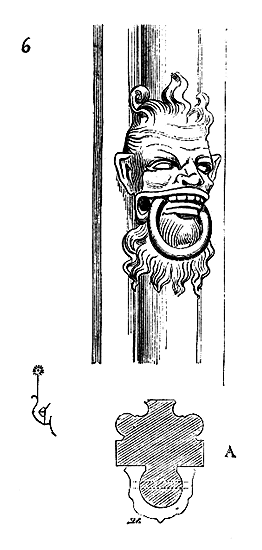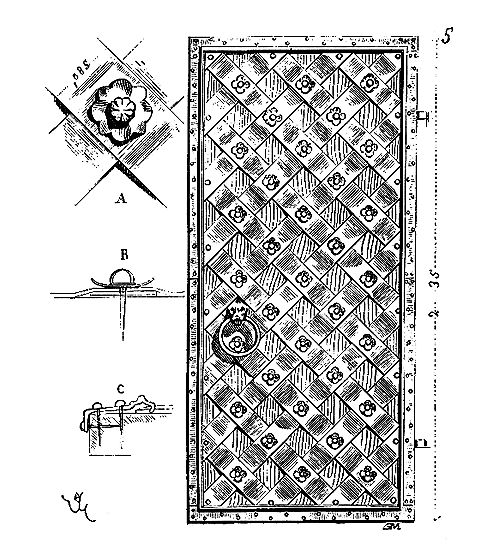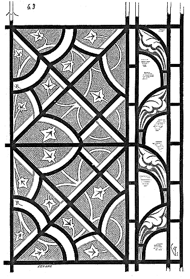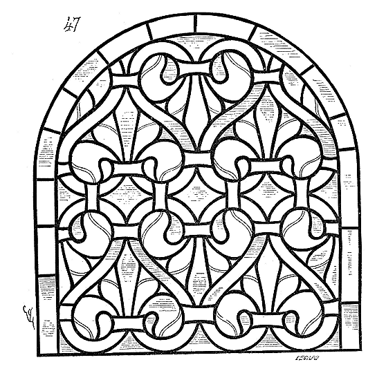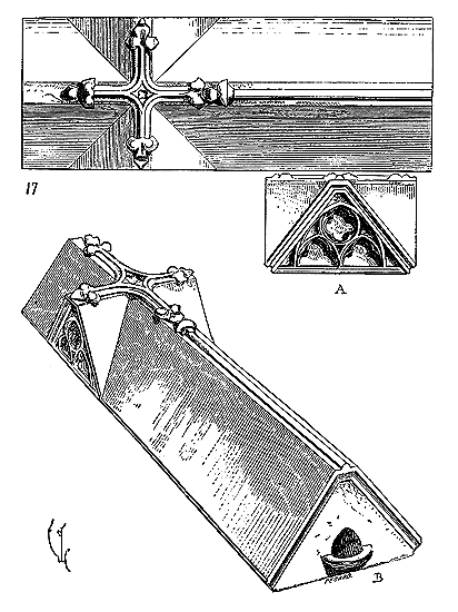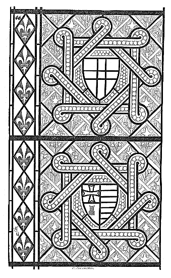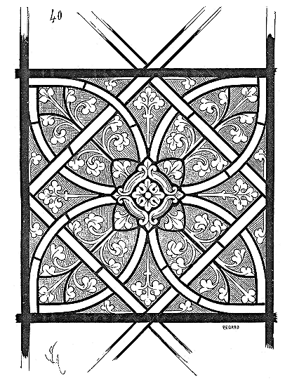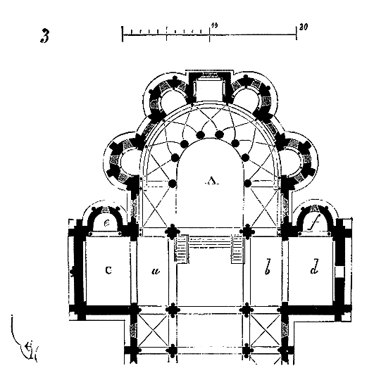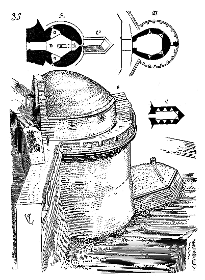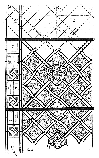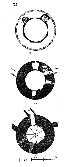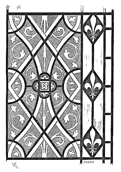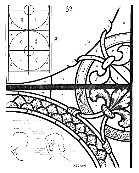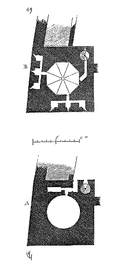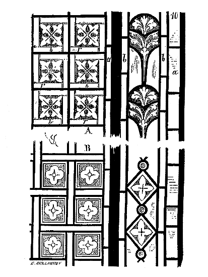 En A, est le porche avec ses claires-voies latérales; au-dessus, les fenêtres vitrées. C'est à peu près la disposition qui subsiste à Aix-la-Chapelle, mais mieux entendue. La rotonde englobée avait conservé ses voûtes et son étage supérieur, qui formait saillie extérieurement sur les parois du narthex et de la grande nef 10. Le triangle équilatéral avait été le générateur du plan de la rotonde. On sait que le triangle équilatéral était un des signes adoptés par les templiers. Des fragments de vitraux fournis par M. de Penguern, et provenant de la chapelle de la commanderie de Brelvennez, laissent voir la croix de gueules entourée de l'orle d'or des templiers et le triangle équilatéral. Dans la chapelle de Saint-Jean de Creac'h, près de Saint-Brieuc, sont placées plusieurs dalles tombales de chevaliers du Temple. Sur l'une d'elles est gravée une petite croix latine, et au-dessous une épée posée diagonalement; entre l'épée et la croix est un triangle équilatéral 11.