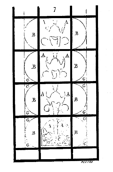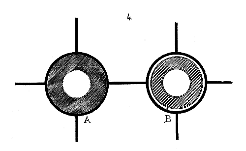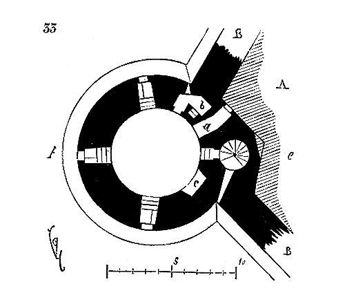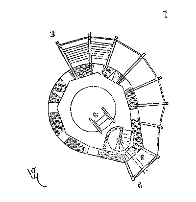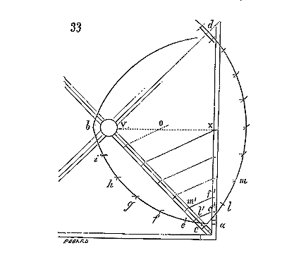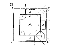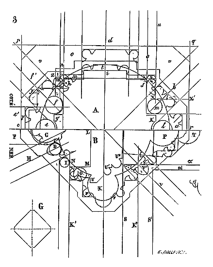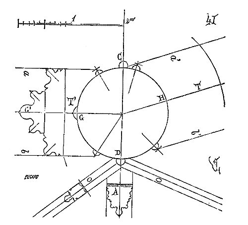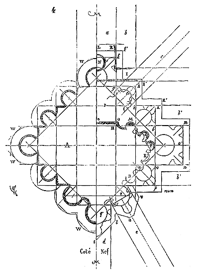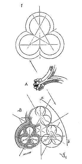 Il ne faut pas oublier que les fondateurs de l'ordre du Temple étaient au nombre de neuf (carré de 3), qu'il ne leur fut permis d'ordonner de nouveaux frères qu'après neuf années, et que les nombres 3 et 9 se retrouvent fréquemment dans les chapelles des commanderies. La grande rotonde de Paris possédait à l'intérieur six piliers, et extérieurement douze travées (fig. 1). Son tracé n'avait pu être obtenu donc que par deux triangles équilatéraux se pénétrant, ainsi que l'indique la figure 3.