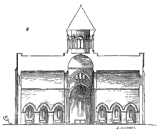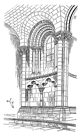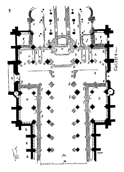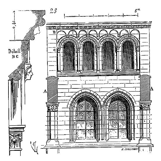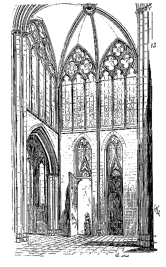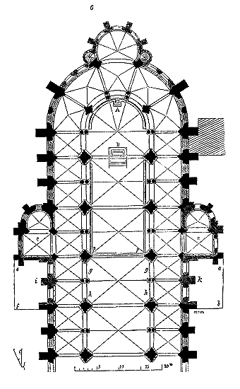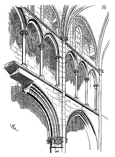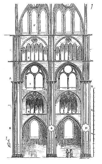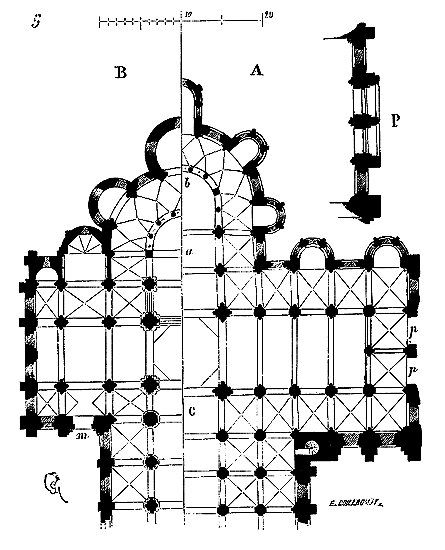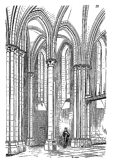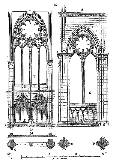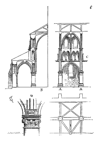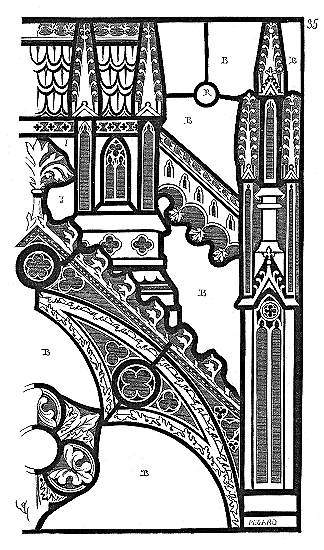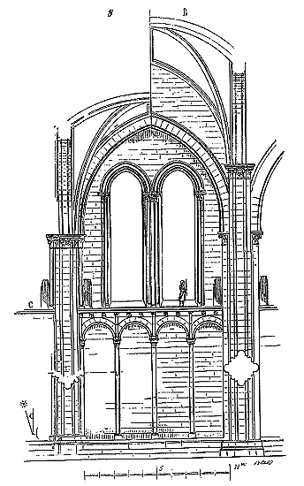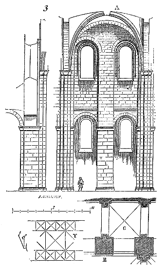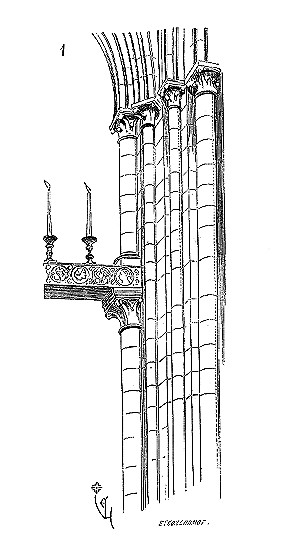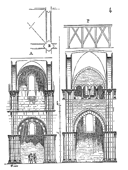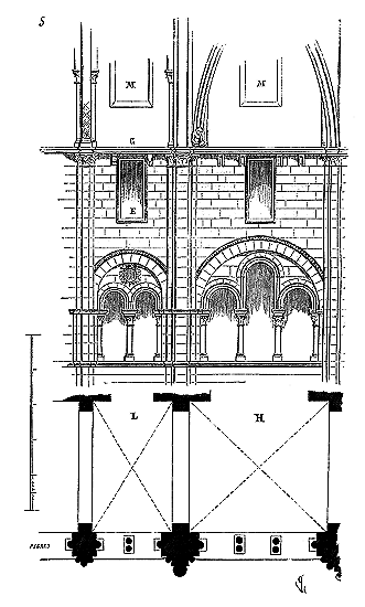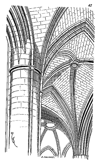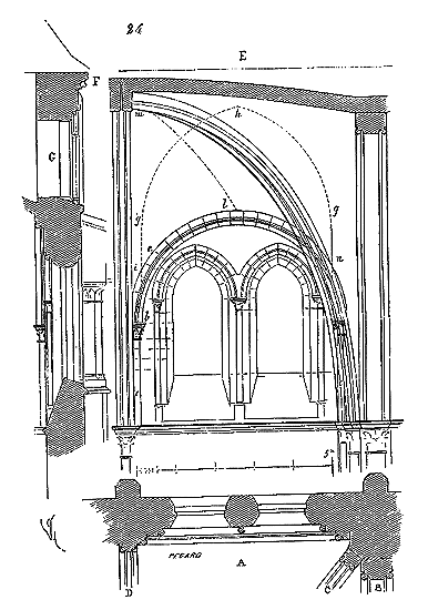 C'est conformément à cette théorie que l'église si intéressante de Notre-Dame de Dijon a été construite. Malheureusement l'exécution peu soignée, faite avec trop de parcimonie et par des ouvriers qui ne comprenaient pas parfaitement le système adopté, laisse trop à désirer. La conception n'en est pas moins très-remarquable et due à un maître savant. C'est en mettant d'accord l'exécution avec la théorie, que ce monument peut être restauré sans beaucoup d'efforts. Il ne faudrait pas croire que ces combinaisons de structure nuisent à l'effet, car certainement l'église de Notre-Dame de Dijon est un des beaux monuments de la Bourgogne. Il ressort même de l'adoption de ce système d'équilibre une franchise de parti, une netteté, qui charment les yeux les moins exercés.