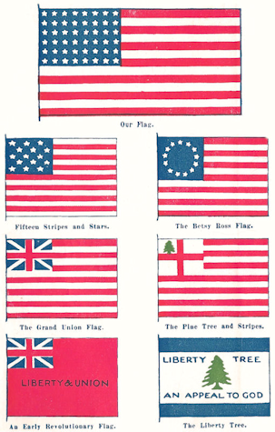 | Flags common among the colonists—The New England Alliance—The pine-tree flag and coins—Flags of the militia—The red coat flag. | |||