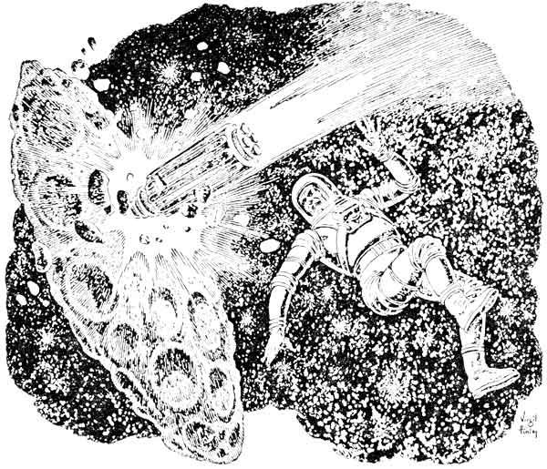 I had switched on four screens, each a different magnification. I pointed to a spheroid on one of the screens and said, "There's the trigger body. It's equipped with a sub-space energizer big enough to get it into sub-space and return it to normal. Then there is a small propulsor unit with just enough energy to send it to the center of that mess. Then it returns to normal space smack dab in the center of the core asteroid. And when the asteroid matter and the trigger body matter try to occupy the same space at the same time.... Watch it go out."