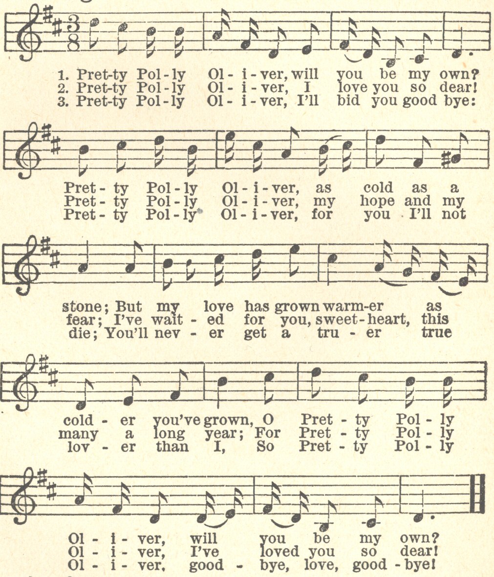 Ol-i-ver, I’ve loved you so dear!3. Pret-ty Pol-ly Ol-i-ver, I’ll bid you good bye: