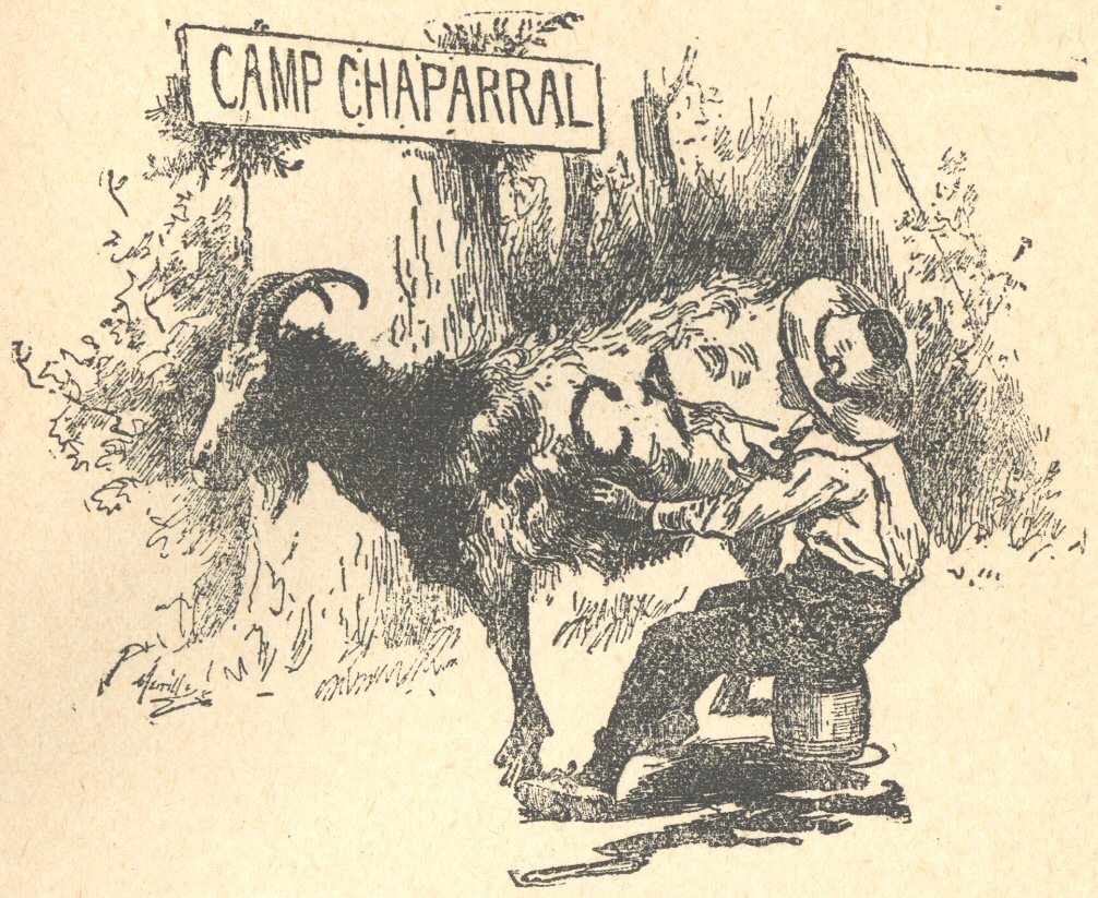 And so Camp Chaparral it was; the redwood board flaunted the assertion before the eyes of the public (which was a rather limited one, to be sure) in less than half an hour, and the artist, after painting the words in rustic letters a foot long, cut branches of the stiff, ungracious bushes and nailed them to the tree in confirmation and illustration of the fact. He then carefully deposited the paint-pot in a secret place, where it might be out of sight and touch of a certain searching eye and mischievous hand well known and feared of him; but before the setting sun had dropped below the line of purple mountain tops, a small boy, who will be known in these annals as Dicky Winship, might have been seen sitting on the empty paint-pot, while from a dingy pool upon the ground he was attempting to paint a copy of the aforesaid inscription upon the side of a too patient goat, who saw no harm in the operation. He was alone, and very, very happy.