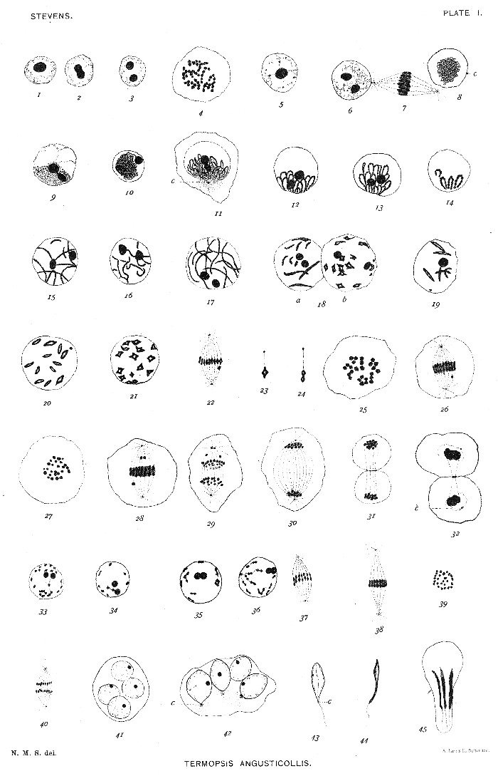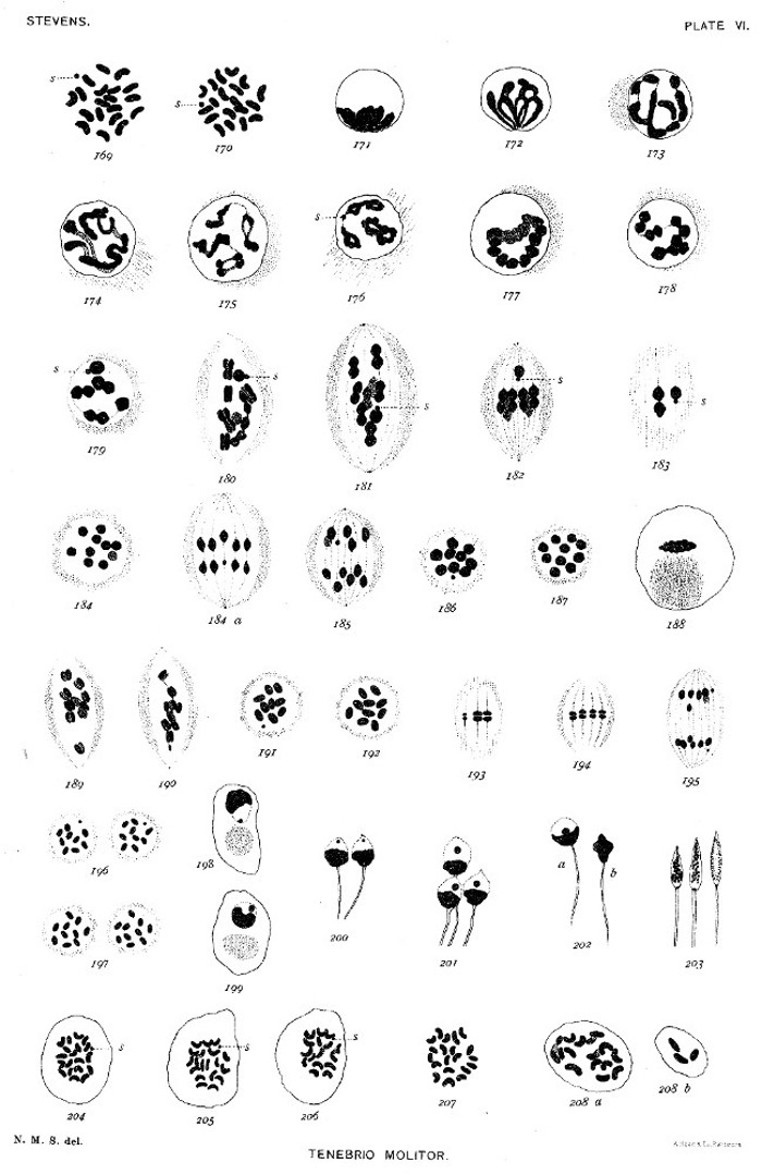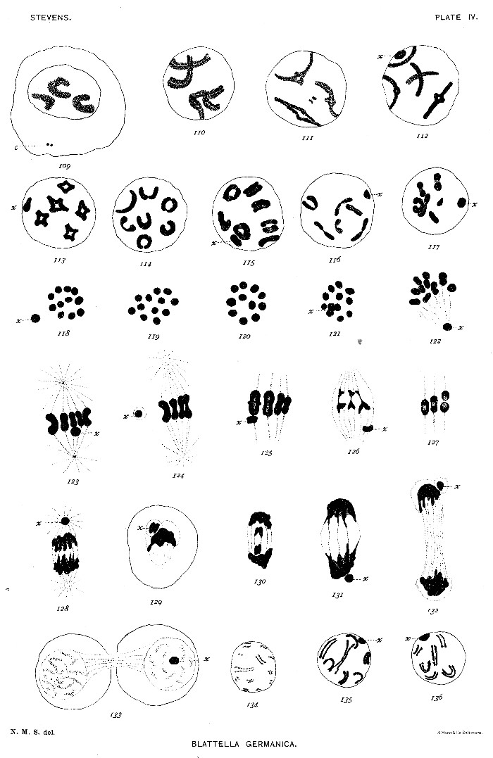 The forms selected for study have been taken from several groups of insects, and are all species whose spermatogenesis has not been previously worked out. They are (1) a California termite, Termopsis angusticollis; (2) a California sand-cricket, Stenopelmatus; (3) the croton-bug, Blattella germanica; (4) the common meal-worm, Tenebrio molitor; and (5) one of the aphids, Aphis œnotheræ.
