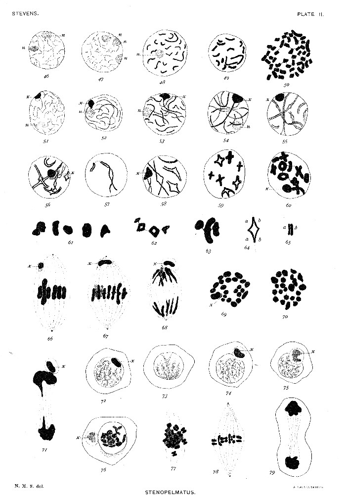 The spermatogonium of Stenopelmatus contains from one to three large nucleoli, which stain much less with thionin than does the spireme (plate II, figs. 46, 47, 48). As the distinct chromosomes come into view in the prophase of mitosis, two are seen to be nearly twice as long as the others, but of equal length (figs. 48, 49, 50.) There are 46 chromosomes in the equatorial plate of a spermatogonial spindle (fig. 50). Besides the nucleolus (n), there appears in the young spermatocyte a conspicuous element (x) which stains deeply with all chromatin stains (fig. 51). It is closely applied to the nuclear membrane and is connected with an end of the spireme (figs. 51-54). At first it is quite small, and it gradually increases in size during the spireme stage. There is no "bouquet stage" in this form. Figure 55 shows the spireme segmented and split longitudinally. The segments have begun to open out at the center to give the cross which is the typical tetrad form in Stenopelmatus. Figures 56, 58, 59, and 60 show various stages in the contraction of the split segments to form crosses and[Pg 6] diamond-shaped rings. The tetrads usually remain connected by delicate linin threads, as shown in figures 57 and 60, also in figures 62 and 63, the latter taken from the metaphase of the first maturation spindle. If these linin connections persist, as they appear to do, from the segmentation of the spireme to metakinesis, the first division of the contracted tetrads must be longitudinal, corresponding to the split in the segments of figures 55, 57, 58, etc. The chromosomes in the metaphase usually appear as dumbbells (fig. 66) or elongated crosses (fig. 67), but occasionally one can be found which still shows its tetrad nature (fig. 64), so clearly indicated in the quadrivalent crosses of figure 59. In the anaphase the chromosomes are often split as in figure 68, and occasionally the two components can be seen as plainly as in figure 65. Figure 61 shows the various shapes assumed by the element x during the tetrad-stage of the chromosomes. This element x almost invariably appears in a vesicle near one pole of the spindle (figs. 67, 68); in exceptional cases it is found nearer the equatorial plate, as in figure 66, or even in the same plane with the ordinary chromosomes, but always somewhat isolated from them. In position and form this element resembles the accessory chromosomes described by Baumgartner ('04) for Gryllus domesticus; in its mode of origin it seems to differ from the other accessory chromosomes yet described.