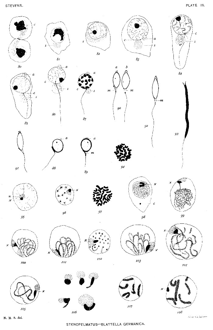 In figure 80, plate III, a pair of spermatids is shown with nuclear membrane formed and the spindle fibers twisted in a characteristic manner. Figure 81 is a slightly later stage with the spindle-remains massed against the nuclear membrane. Curiously enough there appears in the nucleus of every spermatid a body similar to the element x of the spermatocytes of the first order (figs. 82-86). This body is often applied to the nuclear membrane and connected with the spireme (figs. 84-86). It decreases in size and finally disappears (figs. 88-91). The spindle-remains divides (fig. 83), and a small part of it (a) goes to form the acrosome at the apex of the head (figs. 85-92). The larger part is probably utilized in the formation of the tail, for it gradually disappears as the tail develops.
