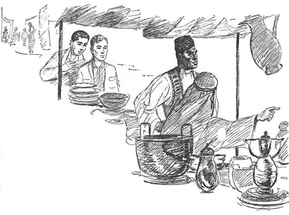 The door was opened by a figure right out of The Arabian Nights, or so it seemed to the young people. The doorman was a huge Negro dressed in flowing red trousers that tucked in at the ankles. His sandals turned up in points at the front, Persian style. An embroidered vest set off a loose white silk shirt, and on his head was a red fez, shaped like a section of a cone, slightly less in diameter at the top than at the bottom.