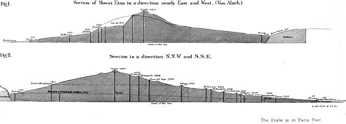 In 1836 Baron Sartorius Von Waltershausen commenced a minute survey of Etna, preparatory to a complete description of the mountain, both geological and otherwise. He was assisted by Professor Cavallari of Palermo, Professor Peters of Hensbourg, and Professor Roos of Mayence. The survey occupied six years, (1836-1842), and the results of direct observation in the form of maps and drawings, occupied a hundred sheets 160 millimetres (6¼ inches) long, by 133 m.m. [Pg 23](5¼ inches) broad. Twenty-nine separate points were made use of in the triangulation; and the scale chosen was 1 in 50,000. The results were published in a large folio atlas, which appeared in eight parts; the first in 1845 and the last in 1861, when the death of Von Waltershausen put an end to the further publication. There are 26 fine coloured maps, and 31 engravings. The cost of the atlas is £12. The maps are both geological and topographical, and they are accompanied by outline engravings of various details of special interest. The Atlas des Aetna furnishes the most exhaustive history of any one mountain on the face of the earth, and Sartorius Von Waltershausen will always be the principal authority on the subject of Etna.