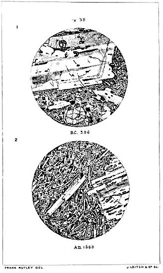 Elie de Beaumont's classification of the rocks of Etna.—Hoffman's geological map.—Lyell's researches.—The period of earliest eruption.—The Val del Bove.—Two craters of eruption.—Antiquity of Etna.—The lavas of Etna.— Labradorite.—Augite.—Olivine.—Analcime.—Titaniferous iron.—Mr. Rutley's examination of Etna lavas under the microscope.