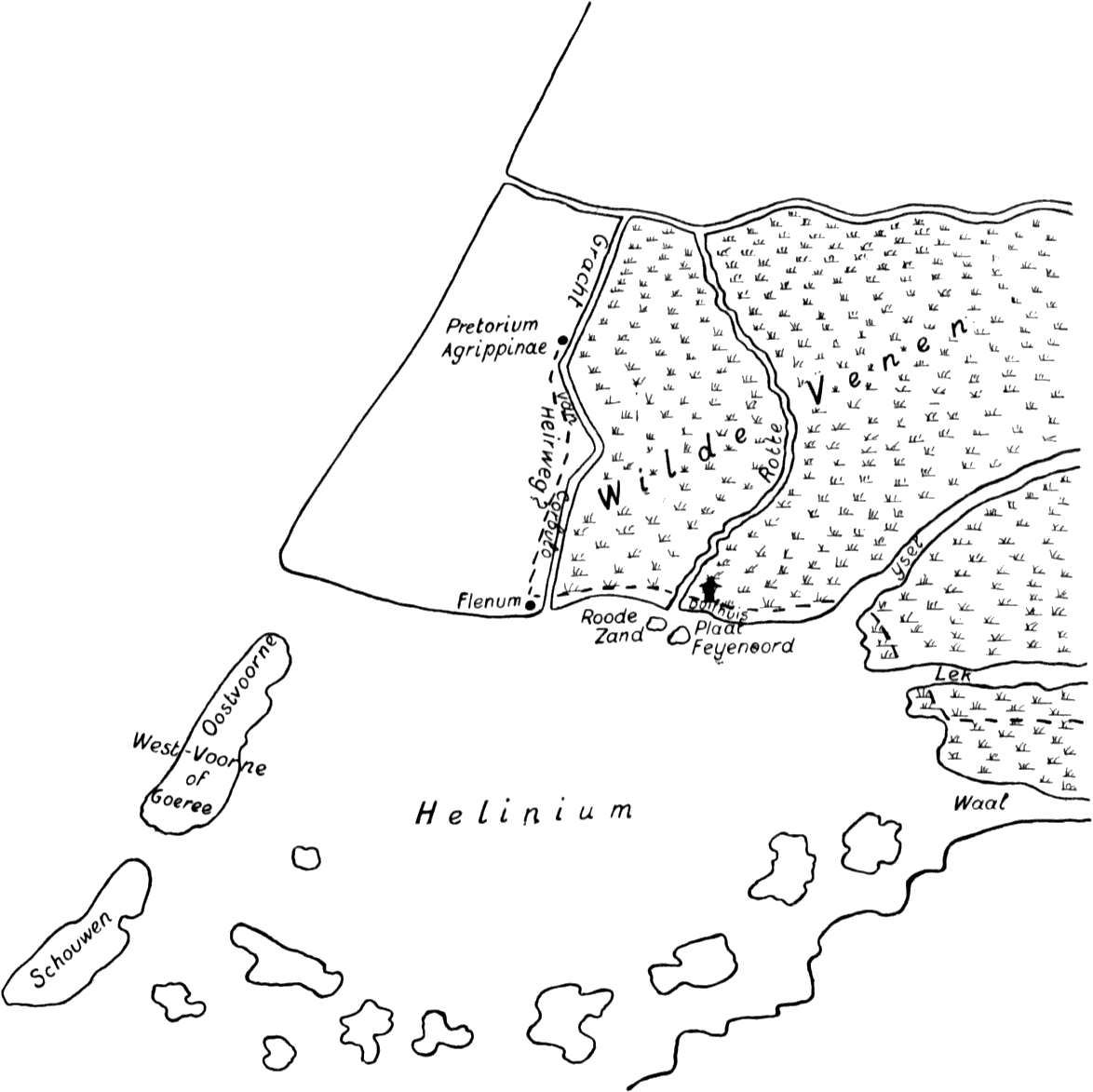 De hooge en droge gronden ten Westen der moerassen waren wel bewoond. Al waren ze ook schaarsch, toch vond men in dit deel van Holland reeds eenige plaatsen. We lezen op het kaartje: Flenum en Pretorium Agrippinae. Het laatste is Voorburg, Flenum waarschijnlijk Vlaardingen geworden.
