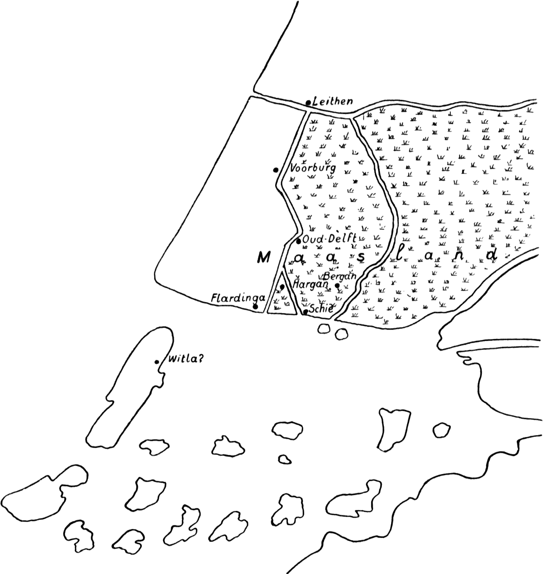 De enkele deelen, die zich aan den mond der Rotte misschien boven de wateren verhieven, kunnen een paar zandbanken geweest zijn.