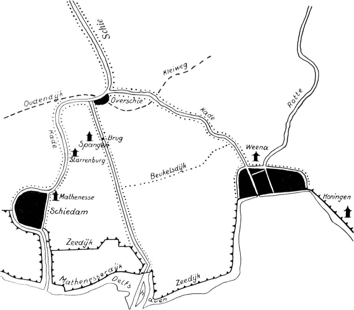 Als we de kaart van Zuid-Holland bezien, vinden we ten Noorden van het Scheur, de Nieuwe Maas en den Hollandschen IJsel een dijk, die het achterliggende land beschermt. Deze zware dijk loopt midden door Maassluis, Vlaardingen, Schiedam en Rotterdam. Hij is daar aan weerszijden bebouwd en draagt in al deze plaatsen den naam van Hoogstraat. Zeker een duidelijk sprekende naam.