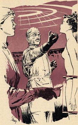 Dr. Kalmar shook his head regretfully. He pushed a button on his desk. It was connected to a gravity generator directly under the girl's chair. Four gravities suddenly pushed her down into it and a hypodermic needle jabbed her swiftly with a hypnotic drug. She slumped. He released the button and the artificial gravity abated, but she remained dazed and relaxed.