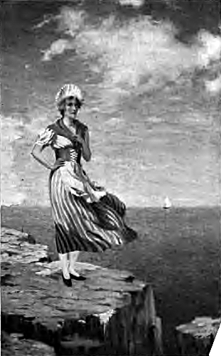 When she came to the top of the cliff, she turned and gazed again at the sea. The sunshine then fell all over her, and her dress came into notice. It was simple enough, yet very effective—a white fluted cap, lying well back on her bright, rippling hair, long gold rings in her ears, and a vivid scarlet kerchief over her shoulders. Her skirt was of wide blue and gray stripes, but it was hardly noticeable, for whoever looked in Christine’s face cared little about her dress. He could never tell what she wore.