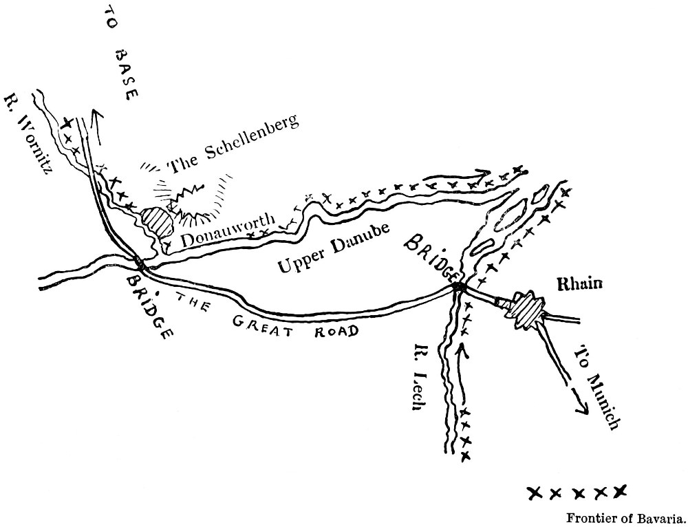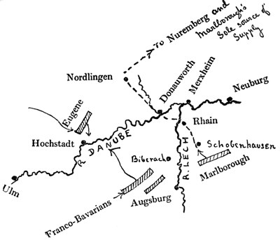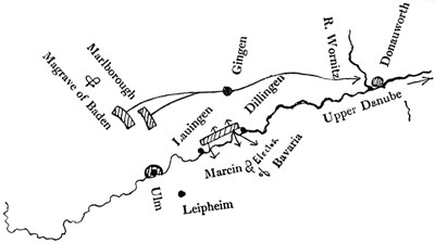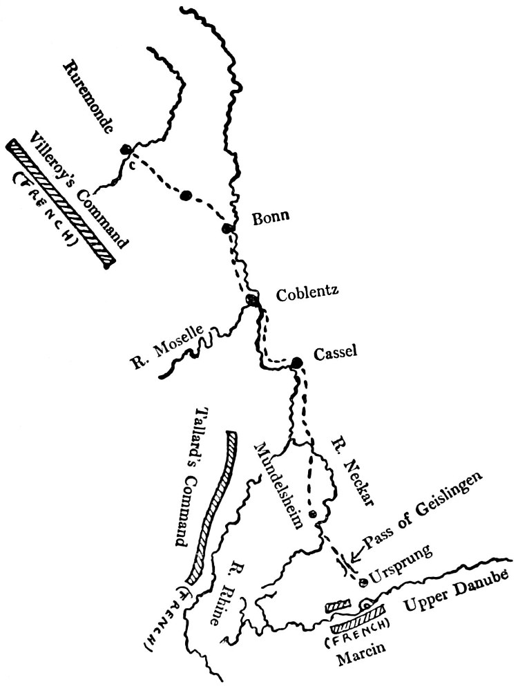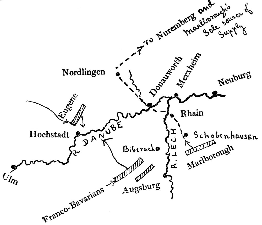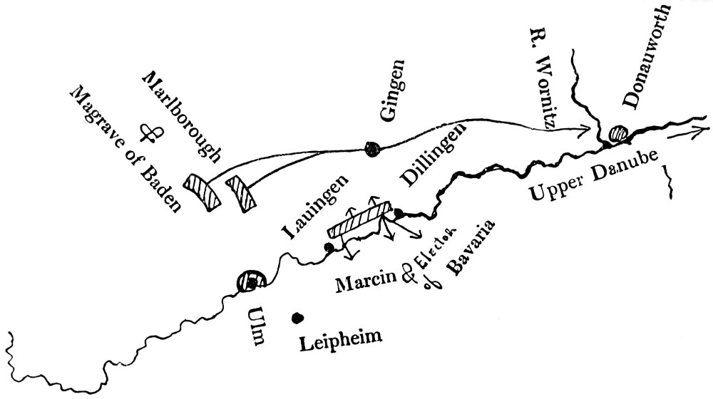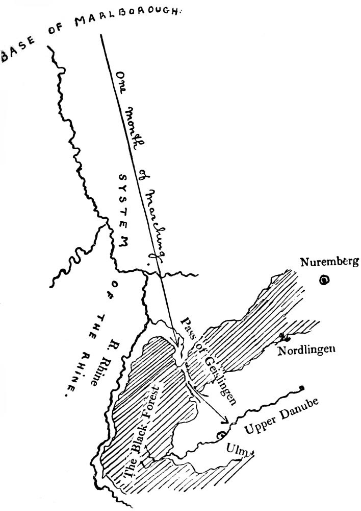 The position of the enemy at the moment when Marlborough’s march to the Danube from the Netherlands was conceived may be observed in the sketch map on page 59.