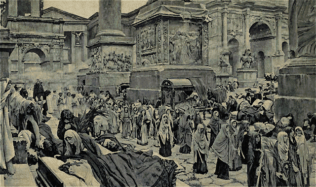 These are only instances of regulations which were so numerous as severely to tax the memory of those who did little else but study to observe them. We are sure that they could not have characterized the common Jewish life; yet there was not a man, however loose in conduct or humble of birth, who was not well versed in the moral precepts of Moses and in the exalted national ideals of the Prophets. In the cases--and they were many--where this wisdom was not justified of her children, the punctilious observance of outward forms, conjoined with the most extreme arrogance of race, laid the Jew open to the contempt of both Greek and Roman. Yet there was enough latent impetus and genuine religious life in Israel to form the basis of that Christianity which was destined to overreach Greek philosophy and to revolutionize Rome; and there are many indications in the Gospels that the credit for the incalculable service of preserving alive the smouldering embers of piety must, to a predominant degree, be awarded to the mothers and daughters of Israel. Elizabeth, no less than Zacharias her husband, was a type of many who "walked in all the commandments and ordinances of the Lord, blameless." There was also one Anna whose devotion was so great that she seemed to make the temple her constant home. Nevertheless, in religion, as in other things, the Jewish women, as all of their sex in the ancient world, were obliged to be content with an inferior position. In the great temple at Jerusalem they were allowed to occupy only the second court: to the Court of Israel, where their male relatives worshipped, they could not penetrate. They had no occasion, however, to complain of lack of space, for in this Court of the Women there was room for over fifteen thousand persons; and, for their convenience, the priests had very considerately placed therein the treasury chests. It was here that the poor widow whom Christ eulogized cast in her "two mites." In this court also was Solomon's Porch, where the Master, recognizing no inequality, taught both sexes alike. In the synagogues, the women of Palestine were obliged to occupy as inconspicuous a position as possible, and on the way thither it was required of them that they should take the back and less frequented streets, in order that the minds of the men might not be diverted from sacred meditations by their presence. This bit of hypocritical phariseeism not only indicates the inferior plane which women were supposed to occupy, but also that, however honored they may have been as wives and mothers, they enjoyed no portent of that chivalry which afterward grew from and was fostered by Christianity.