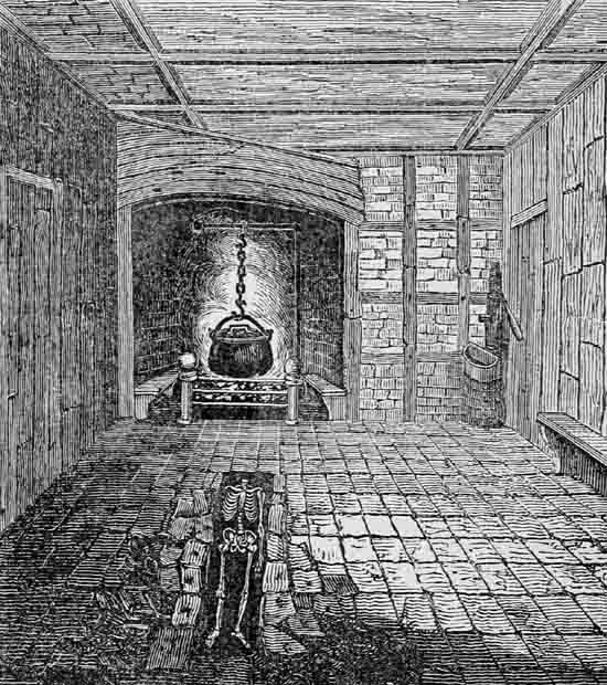 We enter the court yard, and the main portion remaining, which was probably erected by the Lord Steward, occupies the whole of the left side. It is a strong substantial building. The front toward the yard has three doorways having good late-pointed arches, and five two-light windows of small dimensions. Between the doorways are buttresses. At first sight, the building seems as if intended for a large hall, especially from the fine high-pitched roof, and its completeness inside, having all the old timbers remaining. But it appears to have been divided off, and formed into apartments, a considerable portion of the old wood partition-work still remains. It is now used as a stable, barn, and for other farm purposes. The upper end of this long building is joined to a cross portion, apparently the better part of the fabric, but not of large dimensions. This has been modernized 4 to the requirements of a farm-house, and almost all its antient features obliterated. The walls are of great thickness, nearly six feet, and at the end are some later transomed Elizabethan windows, bricked up, and in a small outhouse below is "T.—1684;" a still later time-mark.