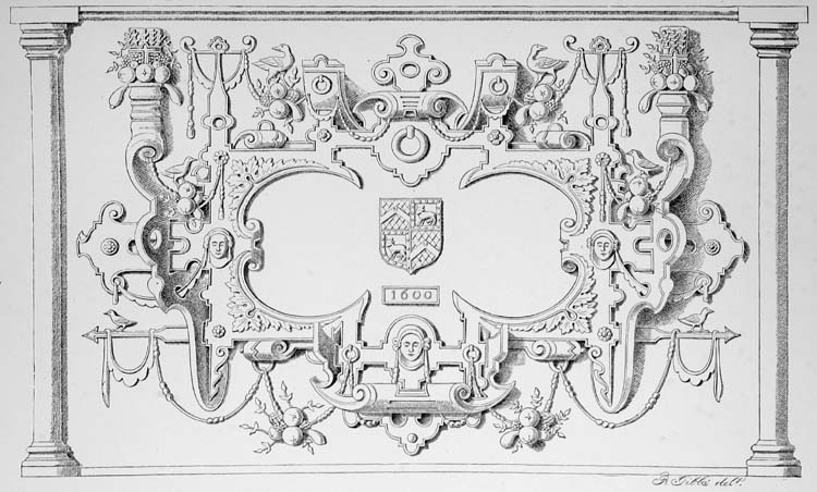 As far as could be observed, what at present remains, appears to be only a small portion of the original structure, but in which direction it extended is not certain. Aubrey, the Wiltshire antiquary, writing in 1650, and who visited Broke about that time, describes it as "a very great and stately old howse" with "a Hall which is great and open, with very olde windowes." There was a "canopie chamber," a dining room, parlour and chapel, and the windows were filled with coats shewing the armorial descent of Willoughby, which he minutely describes; and further, the windows "are most of them semée with Rudder of a Ship, or;"—and again he observes "the Rudder everywhere." We had greatly hoped to have enriched our sketch book with a similitude of one of those rudders, but alas, the most diligent search and enquiry was vain. Not a fragment of the old glazing remained, and neither arms, badge, nor device, was to be found anywhere on the building, sculptured or limned. A small enclosed garden (now used as a rick-plot), skirted with poplars, on the opposite side of the court, was the only other noticeable feature connected with the old place.