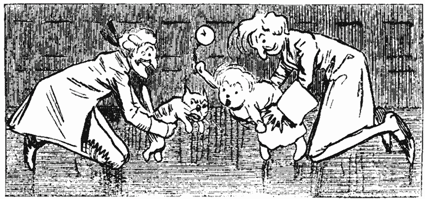 Curtain up. Low arch representing entrance to Old Gray's Inn. Enter a Giant with a long white beard. I think he is Great Grandfather Christmas off Gog and Magog's twelfth-cake. He solemnly salutes the audience in military style. Why military? It suddenly occurs to me, "Is a Masque funny?" I ask my neighbour. He is uncertain. Evidently a cautious man; he will reserve his reply till he has seen it. Enter a Columbine, like "My Lady" used to be on a May Day. She talks to Great Grandfather Christmas, who seems frightened, and tries to back out of it. At present I don't quite catch the plot. Next neighbour says he doesn't think there is a plot. I ask him to look at his book. He says he is looking at it; but it's printed in some dialect he doesn't understand. Enter another Giant, dressed as a Jester. It appears that Great Grandfather Christmas has forgotten his part, or left it in the dressing-room, and the Giant Jester has kindly brought it him. No jokes as yet. No good lines. My neighbour says this is the sort of thing Queen Elizabeth liked. Did she! And the cracked piano, too, for music, which, on the exit of the Giants and the Columbine, comes out as strong as the poor old thing can when supported by violins and violoncellos.