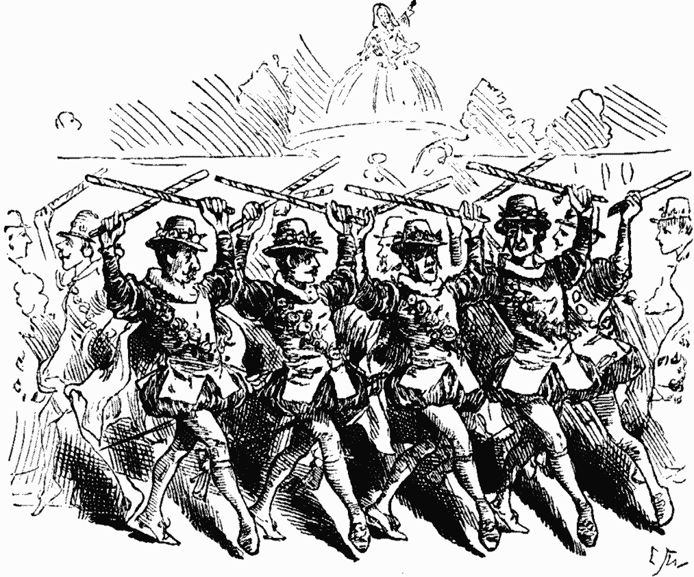 Mr. Punch is perfectly aware that the costumes were due to Mr. Lewis Wingfield's designs and Mr. Alias's workmanship, that the scenery was painted by the old stager John O'Connor, that the music was composed and arranged by Messrs. Prendergast and Birch-Reynardson, and that the dances were invented "with the assistance of MSS." (old English for "Master of the SeremonieS") and taught by the experienced Mr. D'Auban. But the lawyers of Gray's well know that "Qui facit per alium facit per se,"—and in the case of the costumes, Qui facit per Alias facit per se—and so with the merit of what Master Arthur W. à Beckett executes by his chosen agents he himself is to be credited. It was a great success, from first to last. Just one word at parting. Mr. Punch hopes that the Maske, as it is, is not to be reproduced on the public stage. Such a proceeding, by depriving it of its venerable and appropriate surroundings, would vulgarise an entertainment which should have remained, within the precincts of Gray's Inn, archaic and unique.