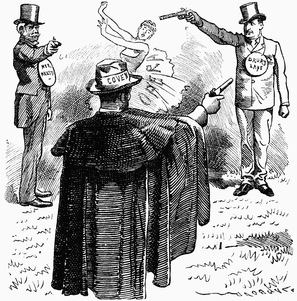 Part the Second.—Young Elizabethan Maidens in front of a bank of roses, and a fountain lighted up, as is the garden, with variegated lamps. "Figures look like Old Chelsea," my neighbour says. I return (because the variegated lamps and the illuminated fountains and the arbours appeal to bye-gone memories),—"Old Chelsea? Yes—Cremorne." Then the Maidens sing a dirge. Perhaps mourning, or Cre-morning, for the departure of lost glories. Then they open out gracefully, and discover the Columbine of Part the First with a lot of young men—(Oh!),—all seated together in the basin of the fountain. The young men in masks—(Aha!—now I see why this is called a Masque!—Now I am happy, whether Queen Elizabeth would have liked it or not!)—come out of the fountain, quite dry, rather unpolitely leaving poor Columbine still in the basin under the dripping water. Maids of the Inn can and do sing charmingly. The Masquers can and do dance. Plot no object. It's all elegant and graceful, but distinctly sad, as how can it be anything else to the accompaniment of that cracked piano, whose temporary absence must deprive Margate Sands of much harmless enjoyment. "They haven't smiled once," I say to my neighbour. "No more have I," he replies crustily, but then explains that Queen Elizabeth didn't like smiling unless she smiled first. The Masquing men are most anxious and attentive to their steps; the Ladies all delightful. Great applause. Encores. And during all this, the unfortunate Columbine remains sitting in the basin, with her feet in cold water, and her head apparently under a dripping douche. She must be of a most contented disposition, as whenever I catch sight of her she is smiling, somewhat vapidly it is true, but still smiling, and beating time on her knees, perhaps to keep herself as warm as possible in such a peculiarly damp situation.