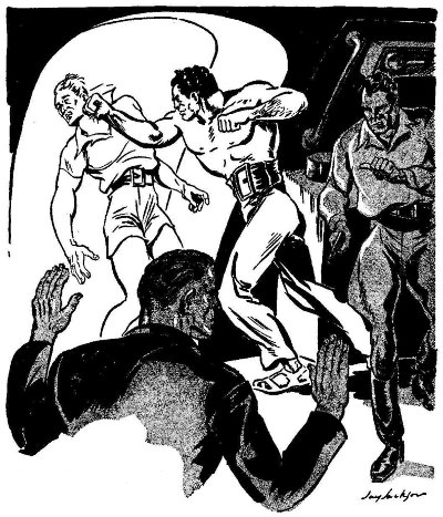 As he ran toward the control room, Hargraves heard the ship begin to radiate a new tempo of sound. The siren was dying into silence, its warning task finished. Other sounds were taking its place. From the engine room in the stern was coming a spiteful hiss, like steam escaping under great pressure from a tiny vent valve. That was the twin atomics, loading up, building up the inconceivable pressures they would feed to the Kruchek drivers. A slight rumble went through the ship, a rumble seemingly radiated from every molecule, from every atom, in the vessel. It was radiated from every molecule! That rumble came from the Kruchek drivers warping the ship in response to the controls on the bridge. Bill Kruchek's going-faster-than-hell engines, engineers called them. A fellow by the name of Bill Kruchek had invented them. When Bill Krucheck's going-faster-than-hell drivers dug their toes into the lattice of space and put brawny shoulders behind every molecule within the field they generated, a ship within that field went faster than light. The Kruchek drivers, given the juice they needed in such tremendous quantities, took you from hell to yonder in a mighty hurry. They had been idling, drifting the ship slowly in toward the planet. Now, in response to an impulse from Nielson on the bridge, they grumbled, and hunching mighty shoulders for the load, prepared to hurl the ship away from the planet. Hargraves could feel the vessel surge in response to the speed. Then there was a distant thud, and he could feel the surge no longer. The anti-accelerators had been cut in, neutralizing the effect of inertia.