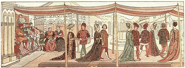 The fair fame of the court of Naples had gone far afield, and not to know of it and of its magnificence, even in those days of difficult communication, was so damaging a confession among gentlefolk, that all were loath to make it. Here, it was known, the arts of peace were encouraged, while war raged on all sides, and here it was that many noble lords and ladies had congregated from all Europe to form part of that gallant company and shine with its reflected splendor. King Robert likewise held as feudal appanage the fair state of Provence in southern France, rich in brilliant cities and enjoying much prosperity, until the time of the ill-advised Albigensian Crusade, and communication between the two parts of Robert's realm was constant. Naples was the centre, however, and such was the elegance and courtesy of its court that it was famed far and wide as a school of manners; and here it was that pages, both highborn and of low estate, were sent by their patrons that they might perfect themselves in courtly behavior. The open encouragement which was accorded to the few men of letters of the time made Naples a favorite resort for the wandering troubadours, and there they sang, to rapturous applause, their songs of love and chivalry. Here in this corner of Italy, where the dominant influences were those which came from France, and where, in reality, French knights were the lords in control, the order of chivalry existed as in the other parts of Europe, but as it did not exist elsewhere in Italy. Transplanted to this southern soil, however, knighthood failed to develop, to any marked degree, those deeper qualities of loyalty, courtesy, and liberality which shed so much lustre upon its institution elsewhere. Here, unfortunately, mere gallantry seemed its essential attribute, and the gallantry of this period, at its best, would show but little regard for the moral standards of to-day. No one who has read the history of this time can fail to be struck with the fact that on every hand there are references to acts of immorality which seem to pass without censure. As Hallam has said, many of the ladies of this epoch, in their desire for the spiritual treasures of Rome, seem to have been neglectful of another treasure which was in their keeping. Whether the gay gallant was knight or squire, page or courtier, the feminine heart seems to have been unable to withstand his wiles, and from Boccaccio to Rabelais the deceived and injured husband was ever a butt of ridicule. Of course, there was reason for all this; the ideals of wedded life were much further from realization than they are to-day, and the sanctity of the marriage relation was but at the beginning of its slow evolution, in this part of the Western world.