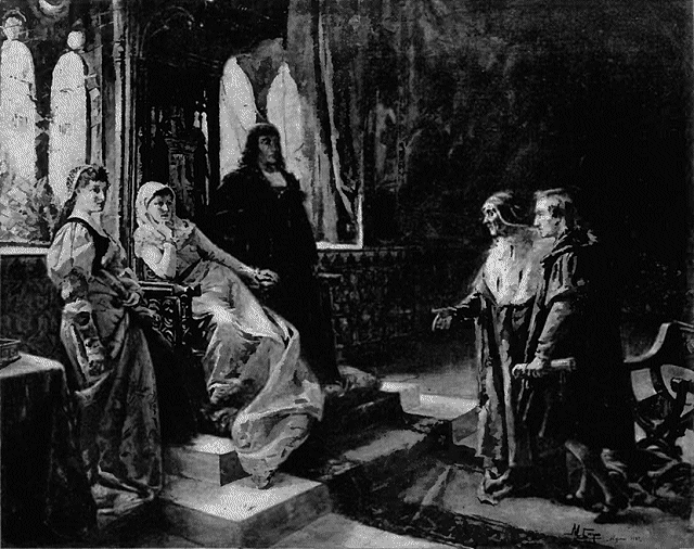 When Petrarch was at the age of thirty-six he received a letter from the Roman Senate, asking him to come to Rome that they might bestow upon him the poet's crown of laurel. Before presenting himself for this honor, however, to use his own words, he "decided first to visit Naples and that celebrated king and philosopher, Robert, who was not more distinguished as a ruler than as a man of learning. He was indeed the only monarch of our age who was, at the same time, the friend of learning and of virtue, and I trusted that he might correct such things as he found to criticise in my work." Having learned the reason of the great poet's visit, King Robert fixed a day for the consideration of Petrarch's work; but, after a discussion which lasted from noon until evening, it was found that more time would be necessary on account of the many matters which came up, and so the two following days were passed in the same manner. Then, at last, Petrarch was pronounced worthy of the honor which had been offered him, and there was much feasting at the palace that night, and much song, and much music, and much wine was spilled.