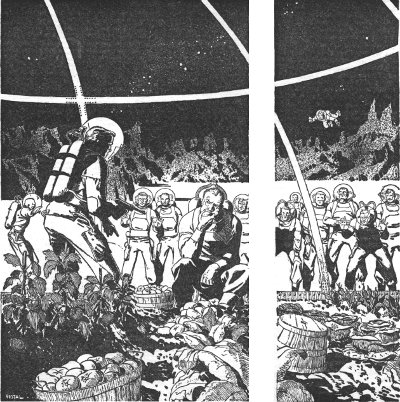 "Remember—we've got to make good here, Johnny," she was saying. "Remember what the Homesteaders Office people told us—that with modern equipment and the right frame of mind, life can be nice out here. It's worked on other asteroids. What if we are the first farmers to come to Vesta?... Don't listen to those crazy miners! They're just kidding us! Don't listen to them! And don't, for gosh sakes, get sore...."