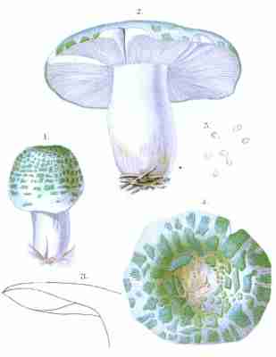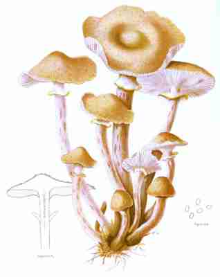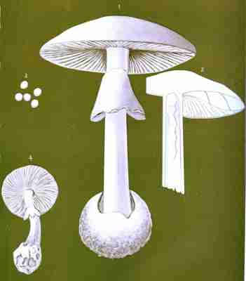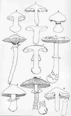 The veil is not a constant feature in the Agaricini, at least it is not always visible. When present it consists of a membrane which extends from the margin of the cap to the stem, veiling or protecting the gills. This membrane, called the cortina, has given its name to a numerous and [Pg 1-10]important class of mushrooms (the Cortinarias). It is generally white, soft, slightly spongy, cottony, at times fibrillose or even slightly fibrous, again in texture comparable to the spider's web, and may be even powdery or glutinous. It exists intact only in the youth of the plant. It is not visible in the developing mushroom, at least while the cap is closely pressed against the stem, but as the cap expands the membrane extends and finally breaks, leaving in some species its remnants upon the margin of the cap and upon the stem in the usual form of a ring or a mere zone. When the stem is not ringed the veil rises high upon the stalk, stretches across to meet the edges of the cap, and is afterwards reflected back over its whole surface.