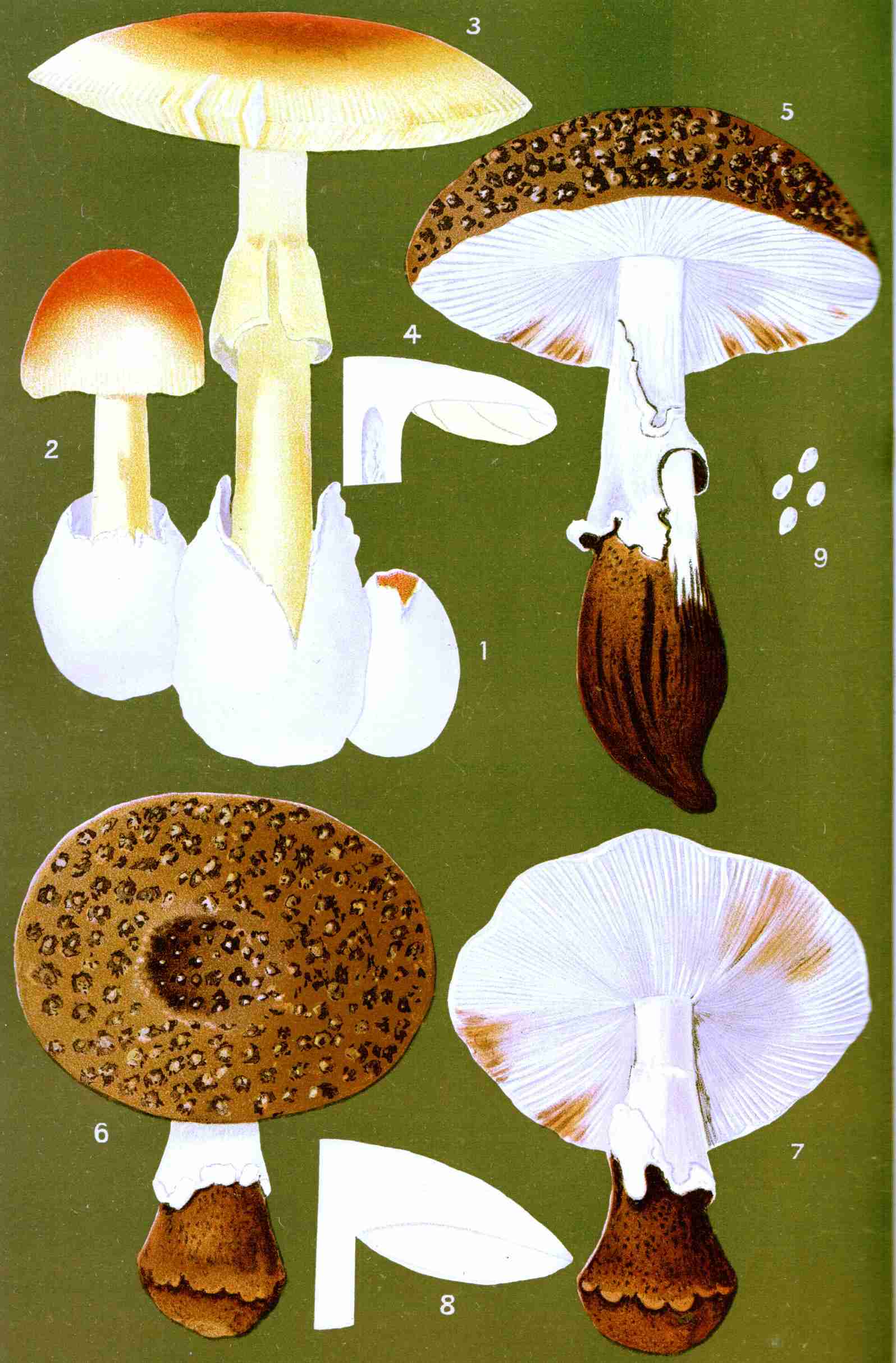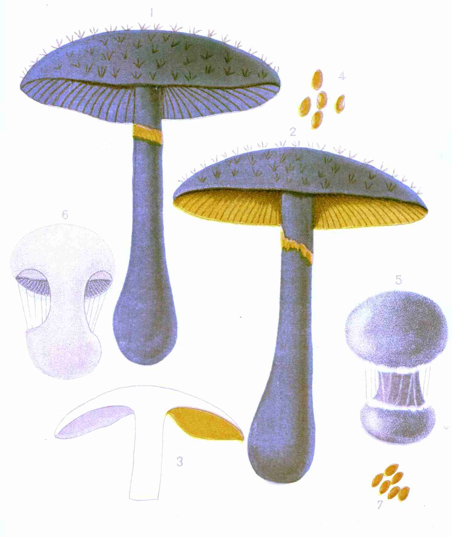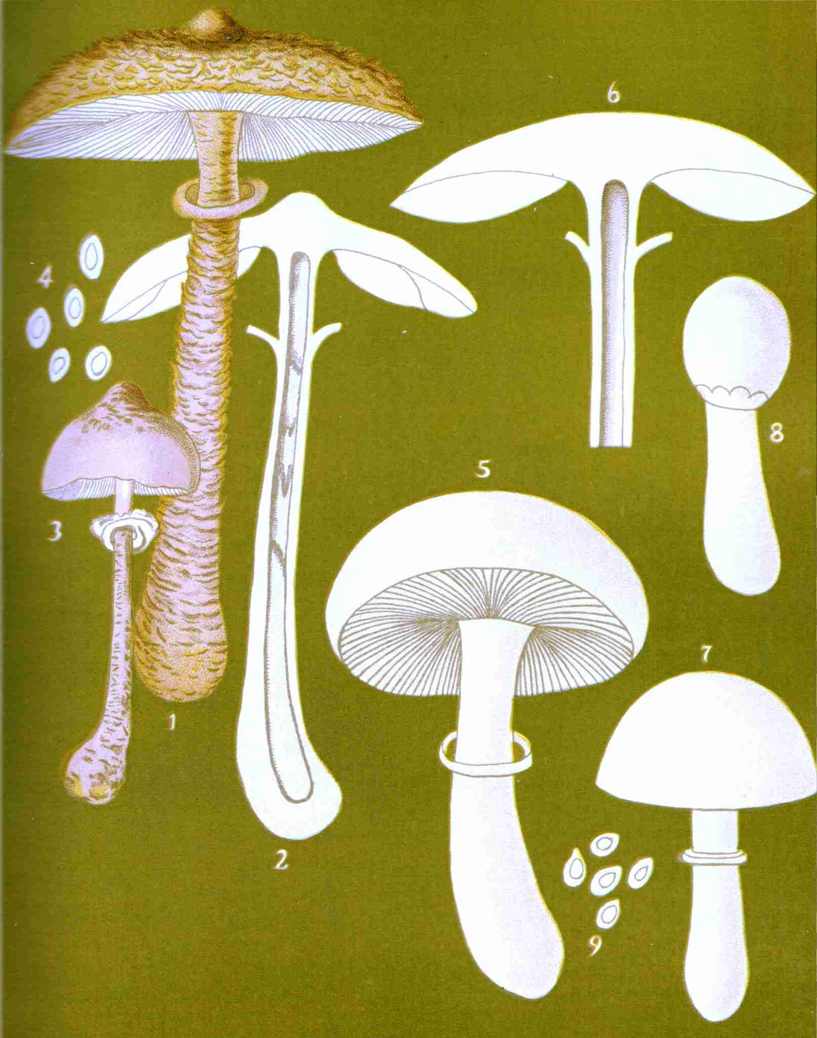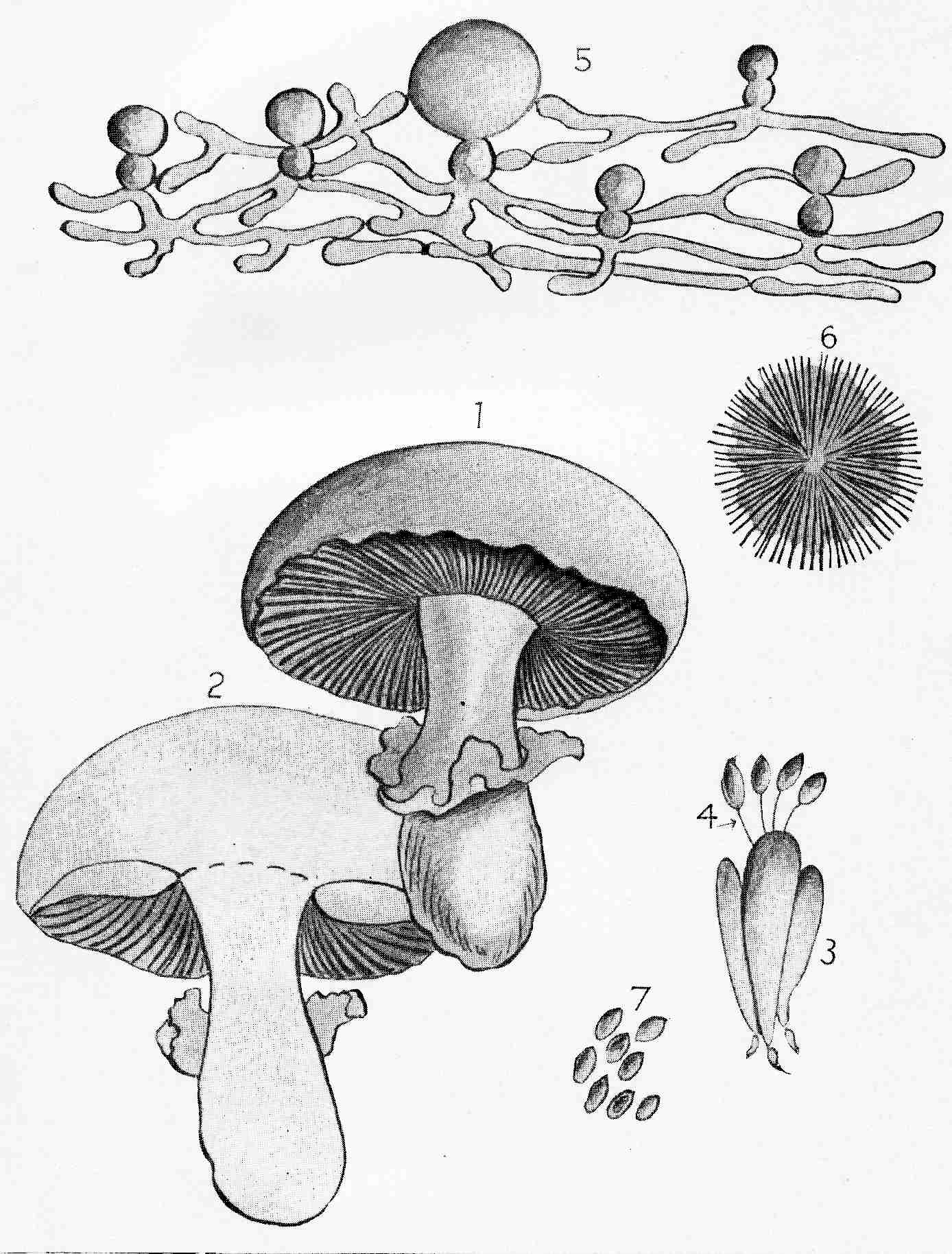 In Plate A is presented a sketch of the common field mushroom, Agaricus campester. Fig. 1 represents the mature plant; Fig. 2, a sectional view of the same; Fig. 3, the basidia, club-shaped cells from the summit of which proceed the slender tubes called sterigmata, which support the spores—highly magnified; Fig. 4, the sterigmata; Fig. 5, the mycelium, highly magnified, supporting immature mushrooms; Fig. 6, the spores as shed from an inverted mushroom cap; Fig. 7, spores magnified.
